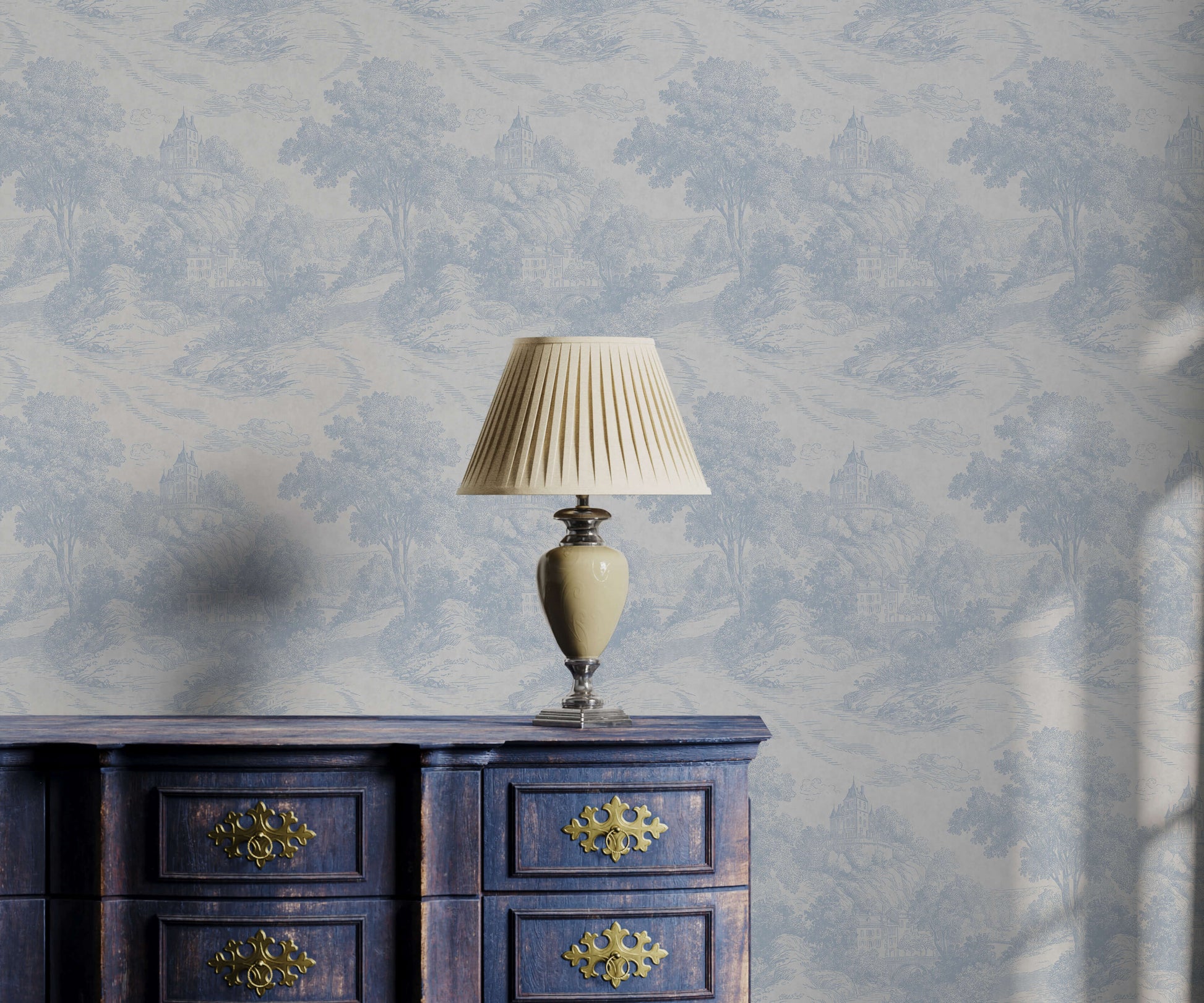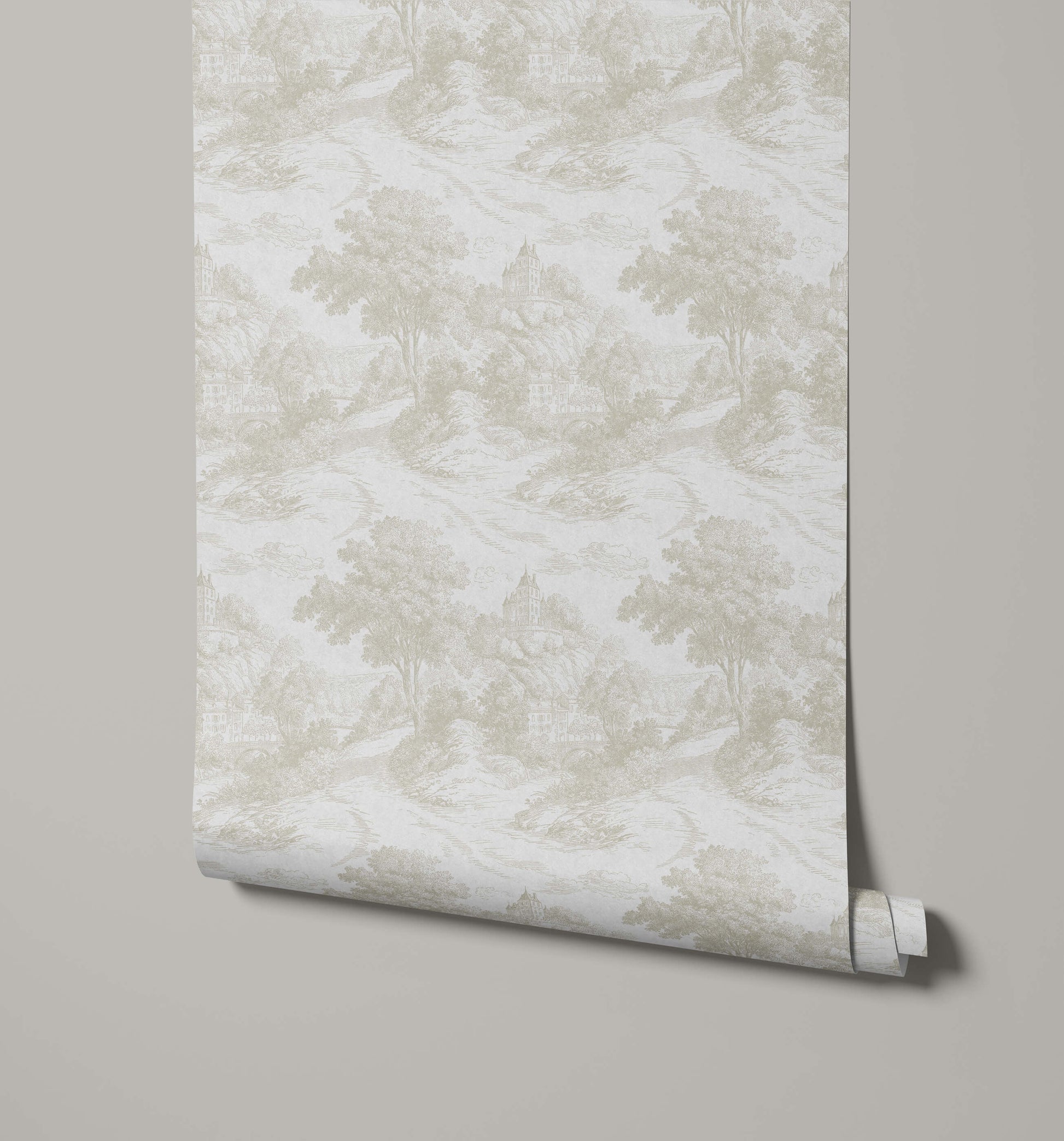 The toile pattern wallpaper offers a sophisticated and timeless pictorial design, transporting the viewer to a beautifully rendered classical landscape. This highly detailed pattern features continuous, repeating scenes of pastoral life, including detailed trees, winding pathways, and distant architectural elements like houses or ruins. The design is executed in a fine, engraved style, creating an all-over tapestry effect that tells a gentle story across the wall.