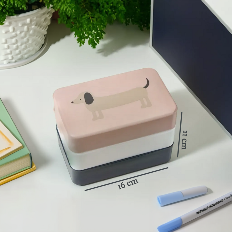 This lunch box will instantly win over animal lovers with its endearing dog graphic. It has three stackable sections in pale pink, white and grey which are held together with a seal strap. Reusable cutlery is included to enjoy a fresh meal anytime.