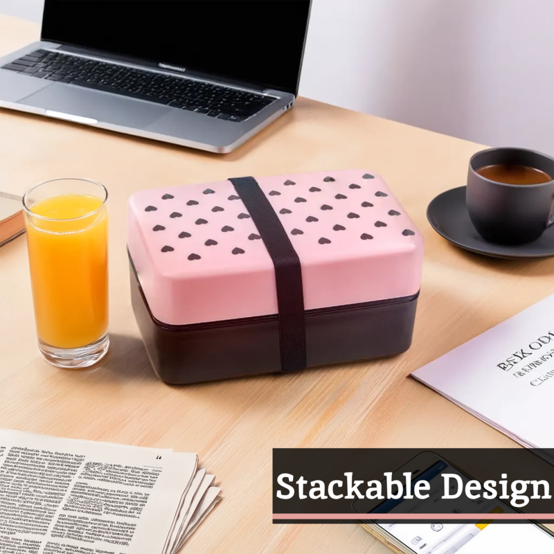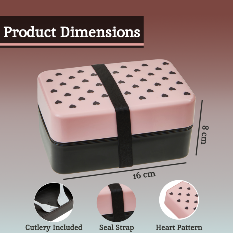 The light pink lunch box with black heartsis perfect for grab and go meals and comes with reusable cutlery. It has 2 stackable compartments to keep the food organised and fresh. A seal strap keeps the compartments in their place to prevent leakage.