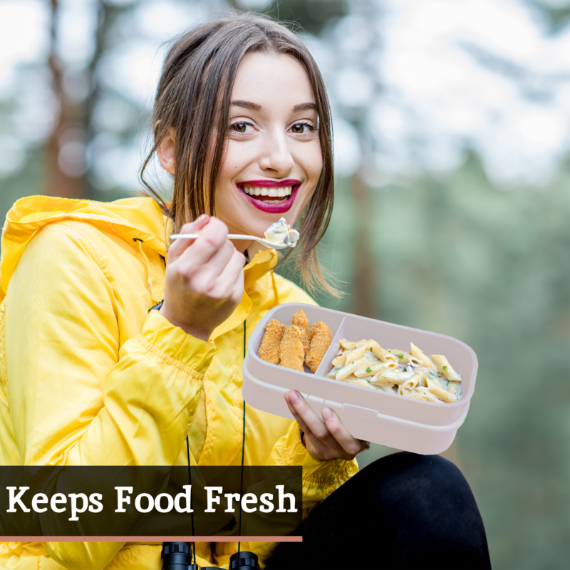 This light pink plastic bento box is perfect to pack lunch for adults and children alike. It has five compartments to keep the meal organized and fresh with a lid to prevent spills. It has a spoon and a fork to enjoy a delicious meal anytime, anywhere.