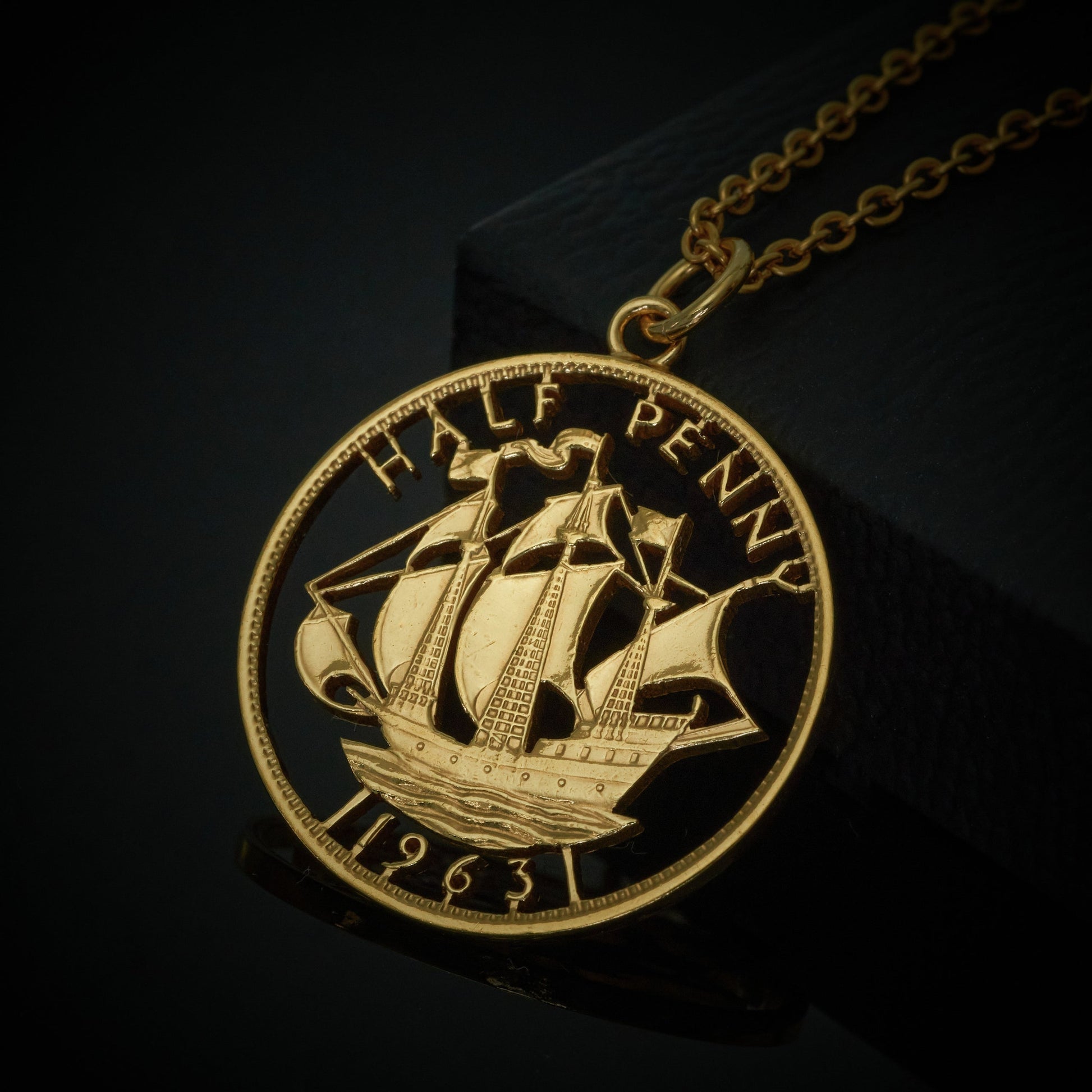 This necklace has been made using a Halfpenny. This coins design focuses on the Golden Hind, the first English ship to sail around the world.