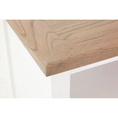 A smooth white cabinet keeps the room bright and composed. The oak surface introduces warm grain and dependable strength. Drawers glide smoothly with carved metal handles that match other Hampstead pieces for a complete look.