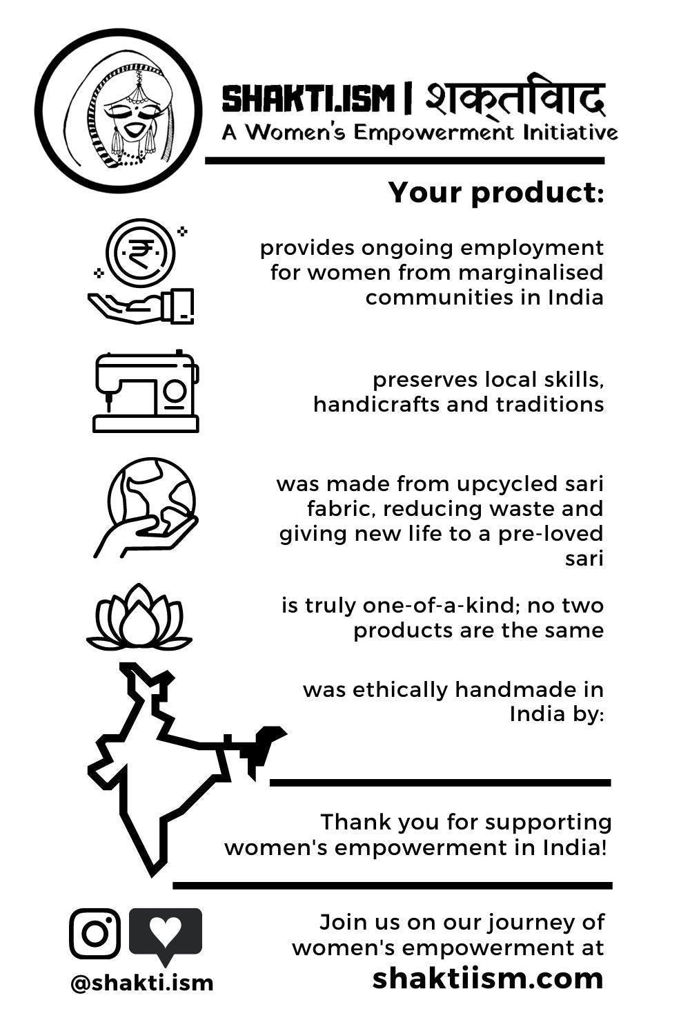 By purchasing this item, you are helping to empower and provide ongoing employment income for the women who make these handmade products. The demand for Shakti.ism’s products provides these women with dignified employment, a living wage, hope and opportunities for their children. Together we can provide alternative options for disadvantaged women with the aim to lift them out of poverty and help them to become self-sustaining and independent.