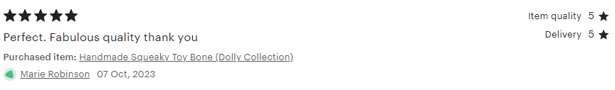 A gorgeous handmade toy bone with squeak! Choose from small (approx. 20cm) or regular (approximately 27-30cm).