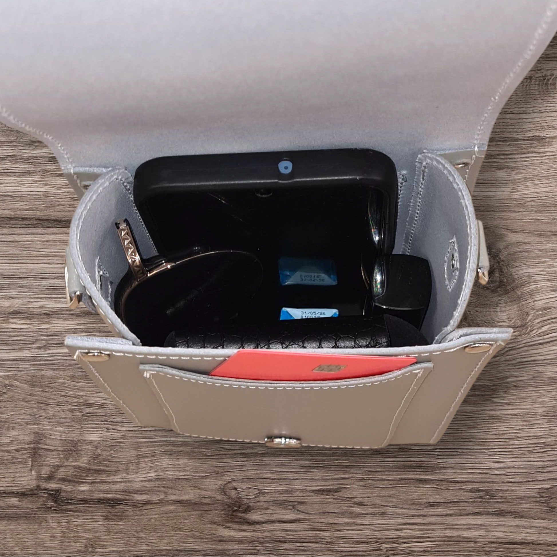 What fits inside? Example contents show: Small purse, keys, bank card, sunglasses, lipstick, gum, smartphone.