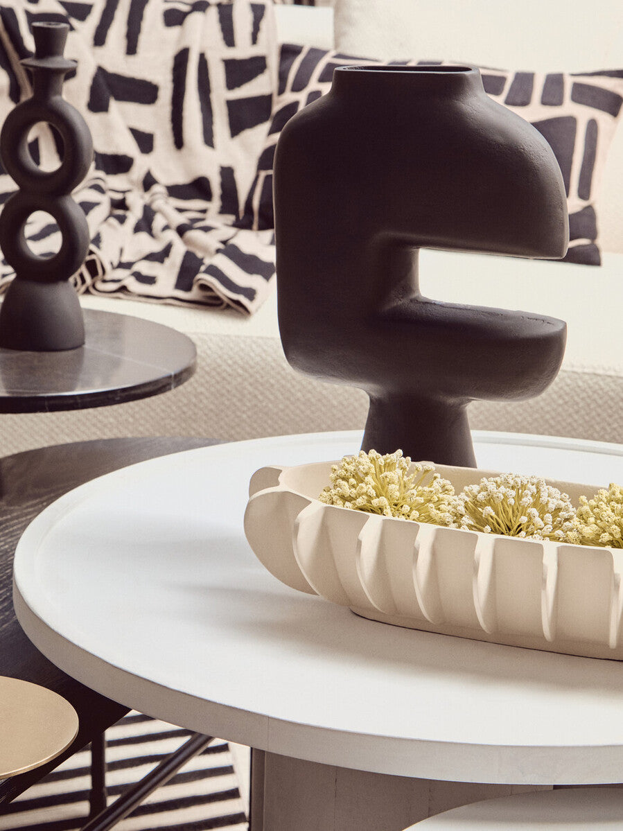 The elongated body and negative spaces introduce movement and depth, softening straight-edged furniture while adding height to your styling. Matte black delivers a refined finish that pairs with monochrome palettes and also grounds colourful rooms.