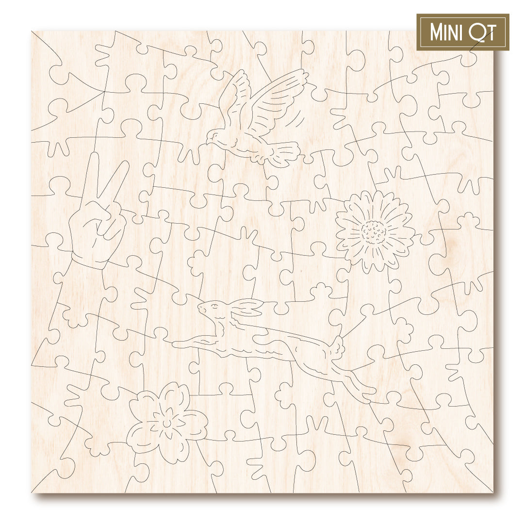 Our MINI QT puzzles are laser cut from thick, 4mm plywood and include 5 whimsies - they make a great puzzle snack!