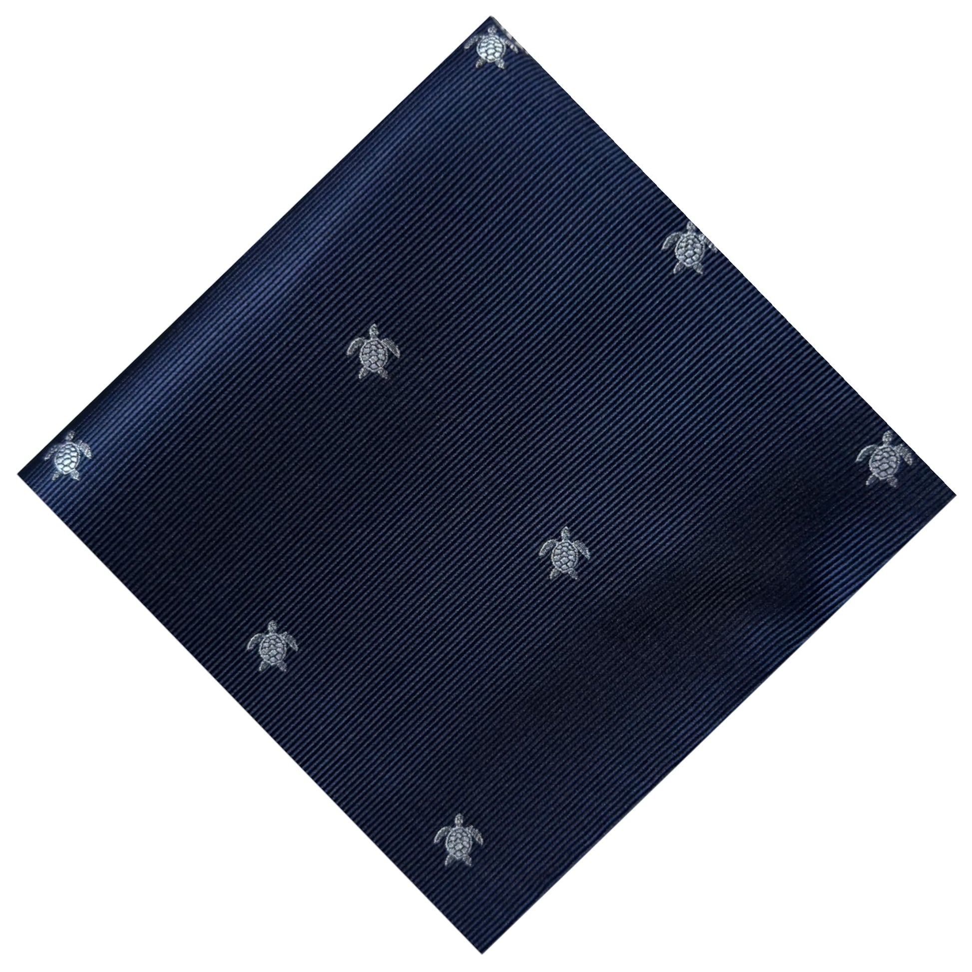 Look sharp with this artfully crafted exquisite pocket square. With a deep blue background and an intricately detailed silver Hawksbill Turtle design, elevate your look to a refined level of luxury.