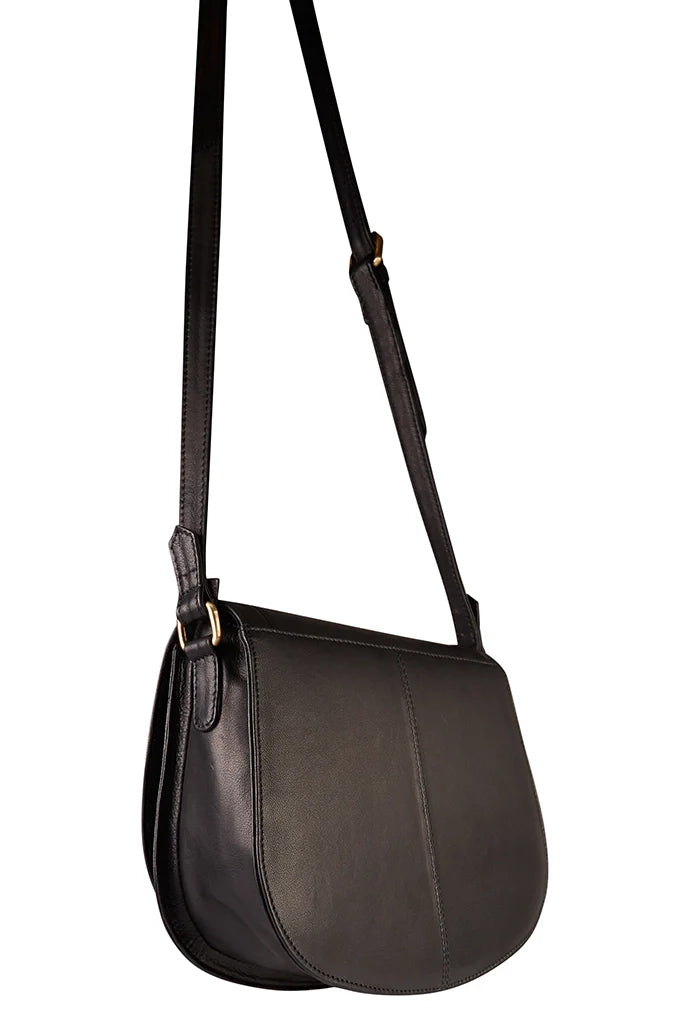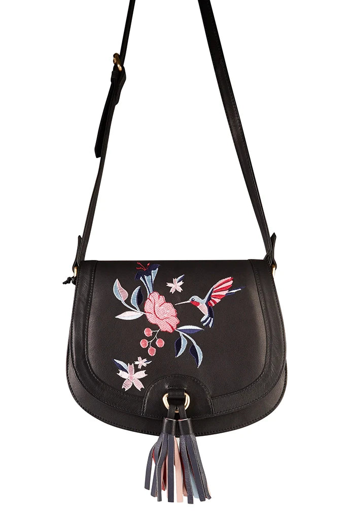 Introducing the Hazel Hummingbird embroidered saddle bag - a beautifully crafted crossbody bag made of soft black leather with intricately embroidered hummingbirds. adding a touch of colour to your outfit. With plenty of room for all your essentials, it's both stylish and practical.