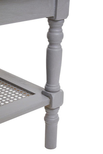 This wooden coffee table in a slate grey finish brings a touch of sophistication, while the cane webbed lower shelf adds a unique, rustic charm. The carved spindle legs provide sturdy support and elevate elegance.