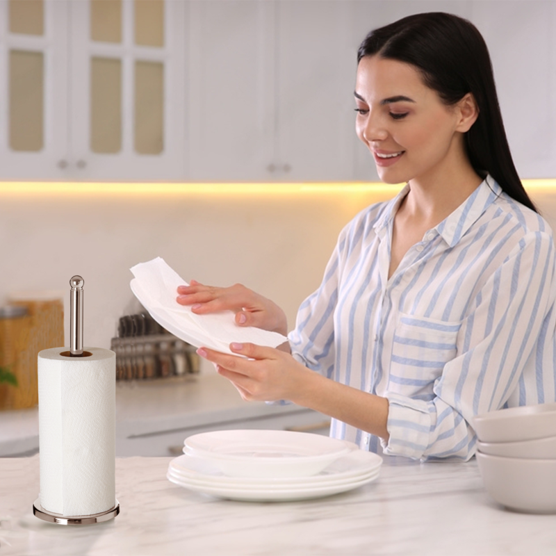This kitchen roll holder keeps absorbent paper close to hand when dealing with spills and splashes. It's made form durable metal and has a polished chrome finish that gives it a reflective look, with a decorative finial at the top of its stem. The wide round base ensures it remains upright and also keeps the paper separated from kitchen worktops.