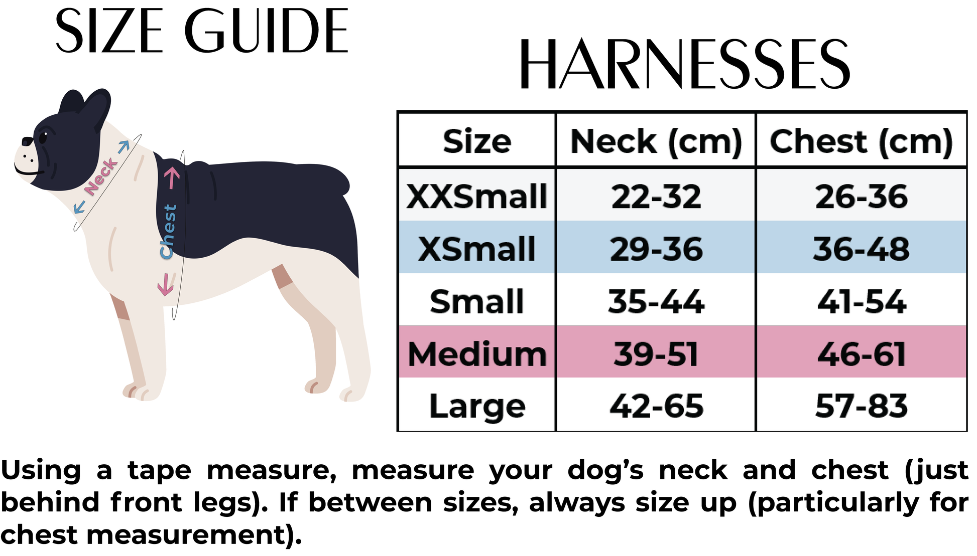 A super soft & comfortable harness, it is FULLY adjustable in the neck + chest straps meaning you can get the PERFECT fit for your dog.