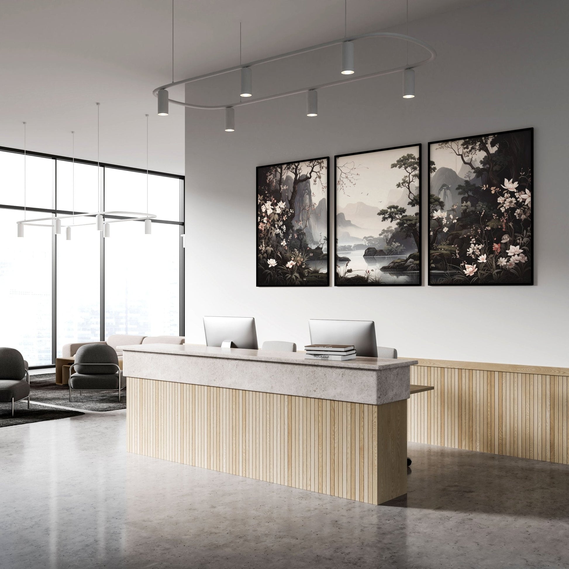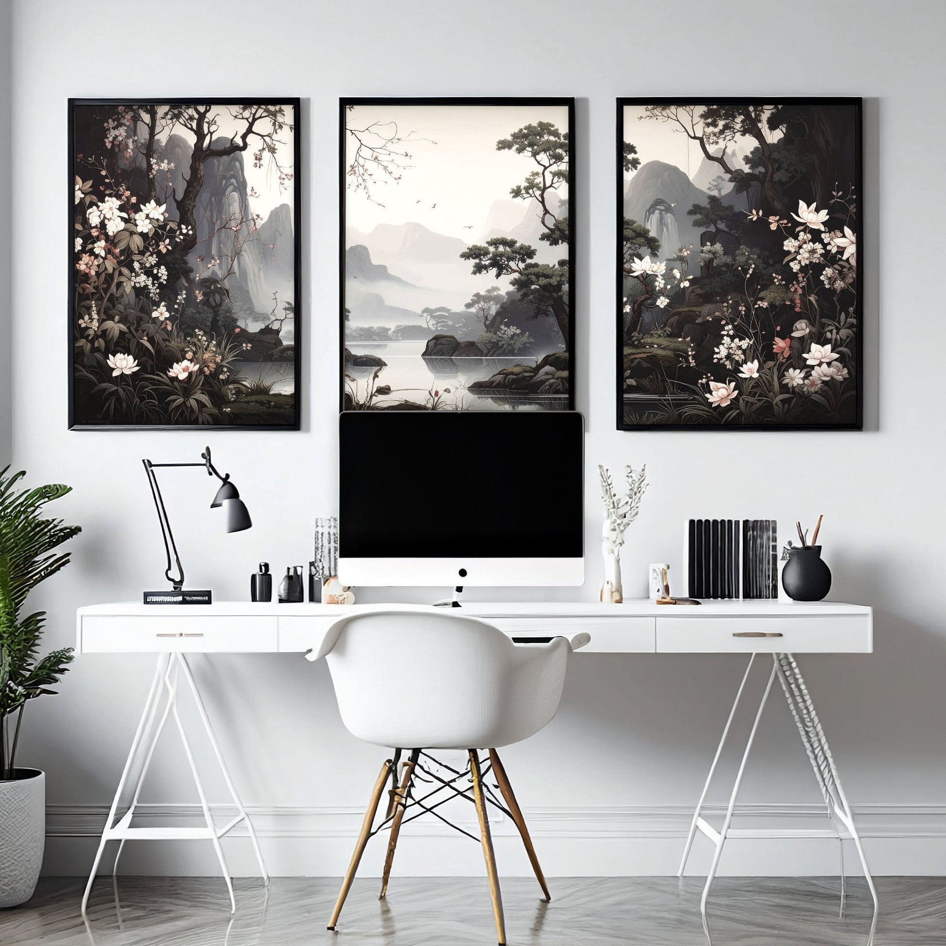 Elevate your office decor with our Huge Posters For Wall, a captivating Set of 3 Chinoiserie Wall Art Prints. Imagine the transformation as your workspace becomes a sophisticated sanctuary with these exquisite designs. The Chinoiserie style, combined with a sleek black and white gallery colour palette, creates an elegant and timeless atmosphere. These wall art prints transport you to a realm of serenity and refinement, offering a visually striking way to inspire and rejuvenate your office space.
