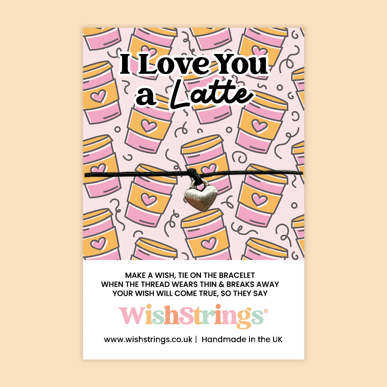 I Love You a Latte WishStrings Wish Bracelet | Cute Coffee Pun Gift | Heart Charm Bracelet on Gift Card | Fun Romantic Token for Coffee Lovers