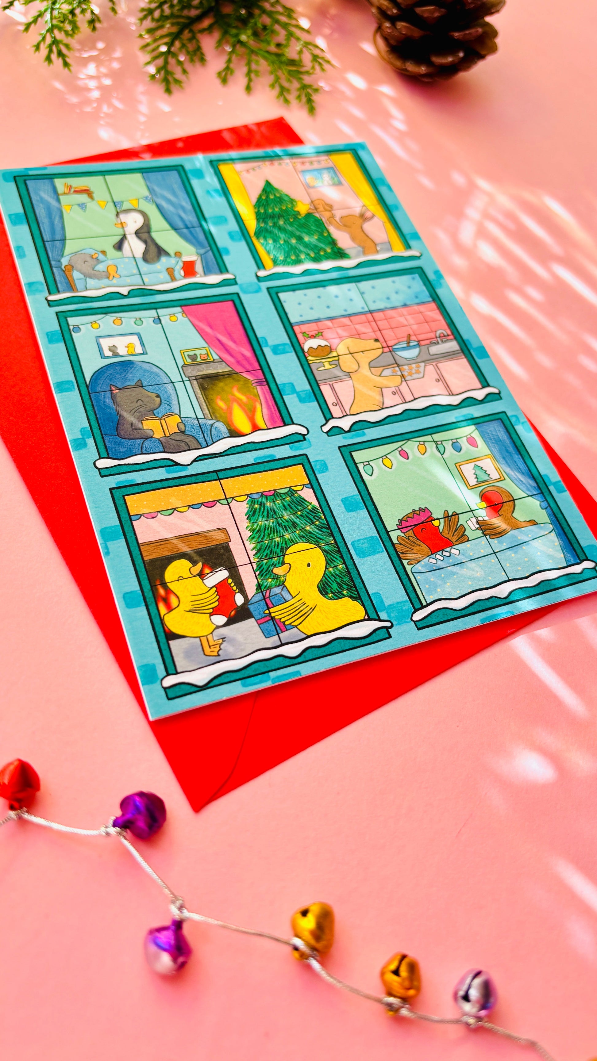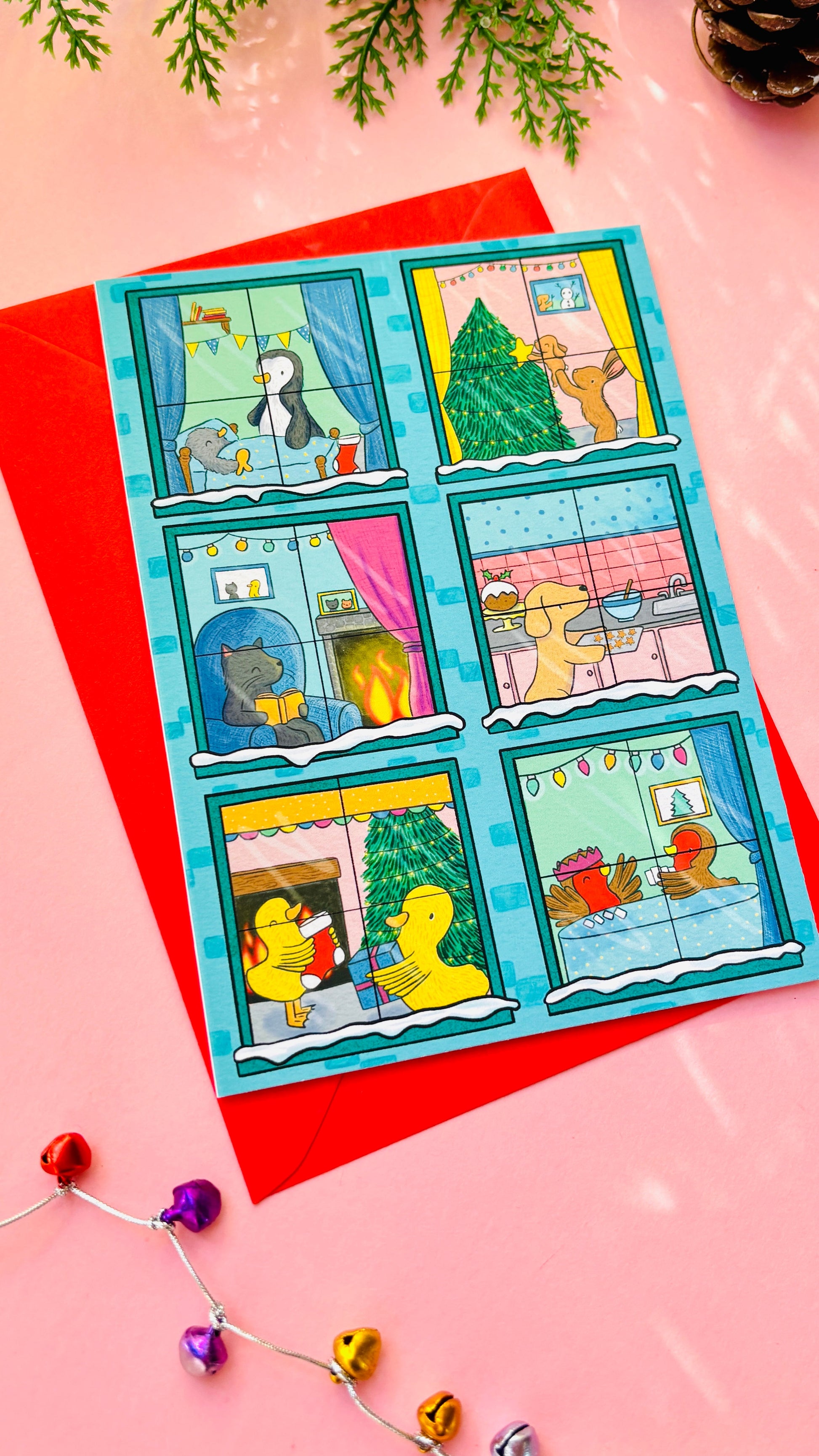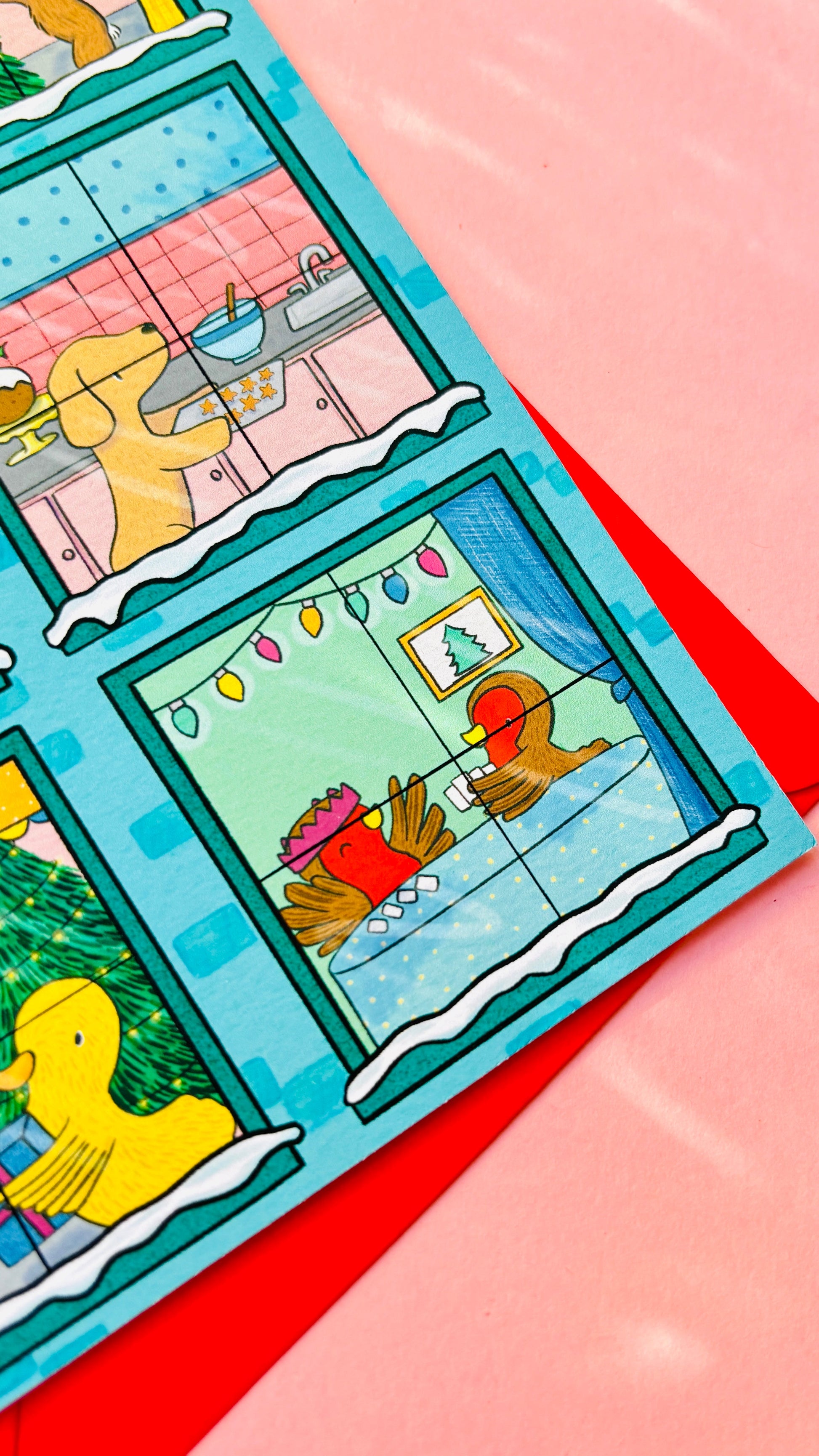 Illustrated to look like a building, each window gives you a peek into the homes of six different animals lives. There is a family of bunnies decorating their tree, penguins getting ready for bed, a cosy kitty reading by the fire, a dog baking biscuits, robins play games and ducks hanging up stockings.
