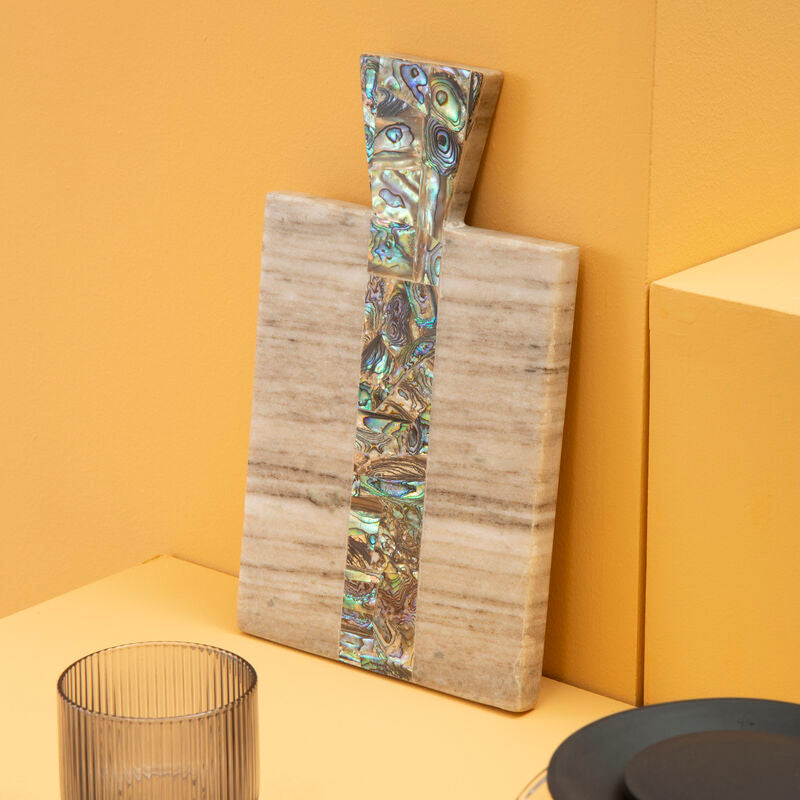 This small paddle board is carved from beige marble which features a straight veining pattern in light and dark hues. It has an exquisite Paua shell stripe across the middle of its muted toned surface and handle which gives them a texture. The iridescent tones lend this multifunctional board a minimal gleaming touch.