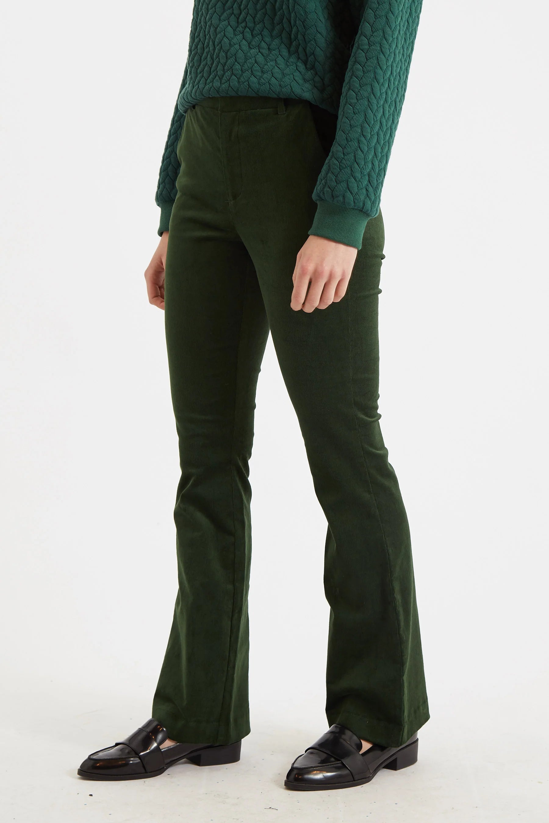The Jayelyn baby cord flared trouser is crafted in a luxurious baby cord fabric, providing both comfort and stretch. Its forest green hue adds a vibrant touch to any wardrobe, Styled here with our Jan sweatshirt.
