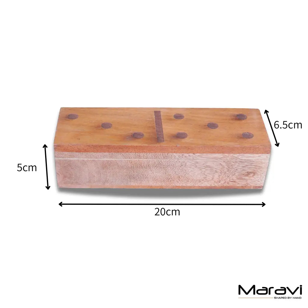 Each domino tile is carved and engraved with traditional dot markings, with every piece showing its own natural wood grain and variation for a truly unique finish. The set is stored in a solid wooden box, cleverly designed in the shape of a domino itself. The lid features inlaid dot detailing, adding a playful touch, while the sturdy hinged construction keeps everything safe and easy to store.