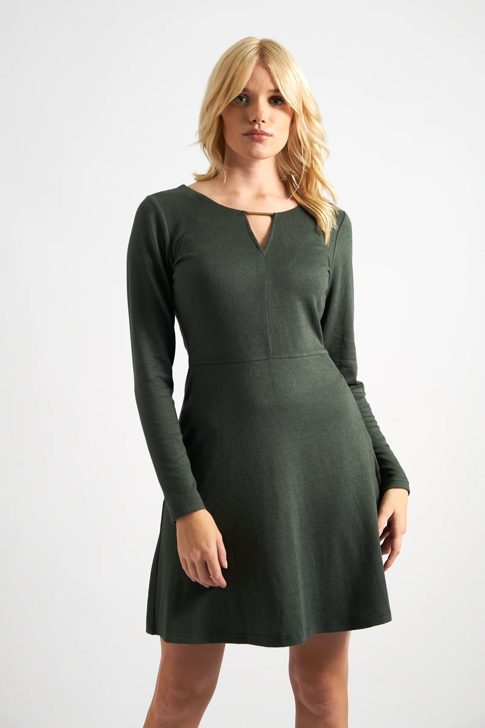 Introducing the must-have Josy soft brushed marl jersey skater style mini dress in a flattering forest green. Designed for comfort and style, this dress features a bar detail V insert neckline and practical side seam pockets. Elevate your wardrobe with this flattering and versatile dress.