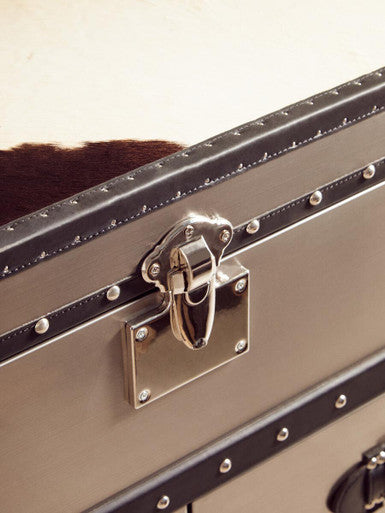 Genuine hide panels are matched for a balanced pattern. Leather trim reinforces edges and adds tactile warmth. Steel clasps and corner details introduce a subtle industrial note while ensuring daily durability.