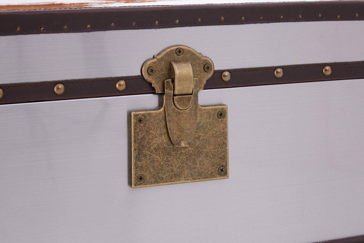 The lift top reveals two organised compartments, secured by steel clasps for neat daily routines.