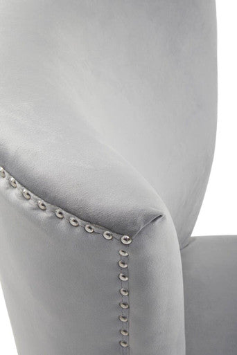 Kensington Townhouse upholstered in a luxurious grey velvet, this dining chair has generous, deep-cushioned seat complemented by a wingback. Black finish natural wood legs form a contrast with the plush velvet while stud detail trim enhances the luxe accent."