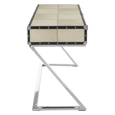 Below, polished Z-shaped legs introduce a contemporary silhouette that feels both light and sculptural, allowing the piece to sit beautifully against a wall without overpowering the room.