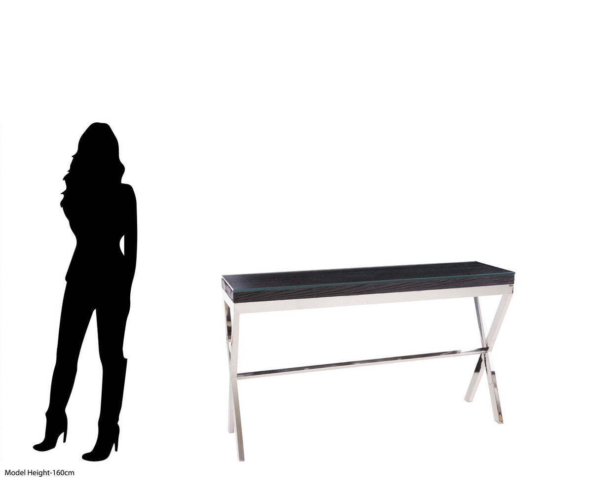The striking silver stainless-steel frame features crisply intersecting legs that create architectural interest while delivering long-term stability. A sleek black natural wood surface topped with clear glass completes the composition, offering a polished stage for decor, lamps, and framed photos.