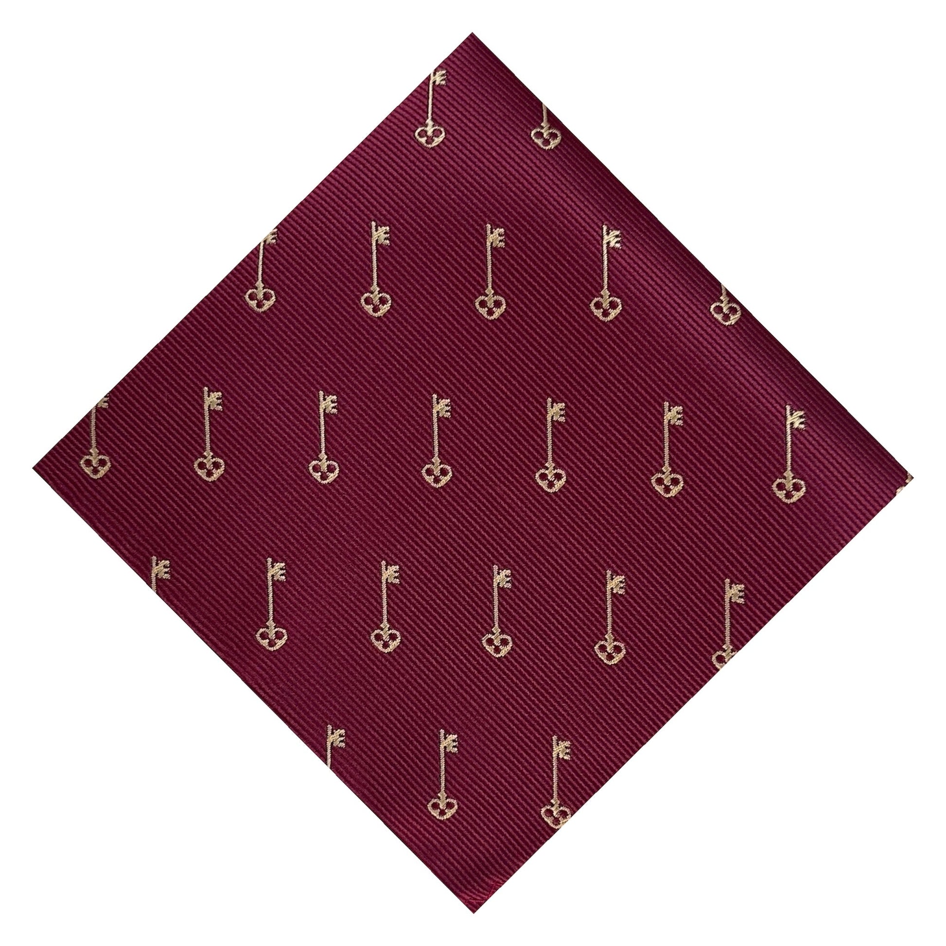 A rich burgundy pocket square featuring exquisite gold skeleton key embroidery.
