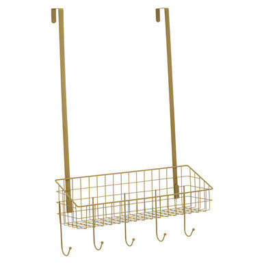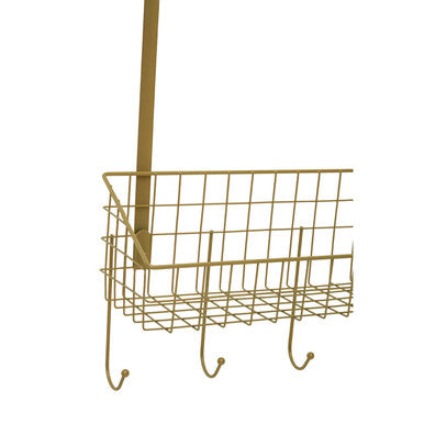 This over the door hanger shelf with five additional hooks, is ideal to store or hang a variety of accessories. The sturdy iron wireframe is adorned in warm metallic finish that prevents rust and scratches.