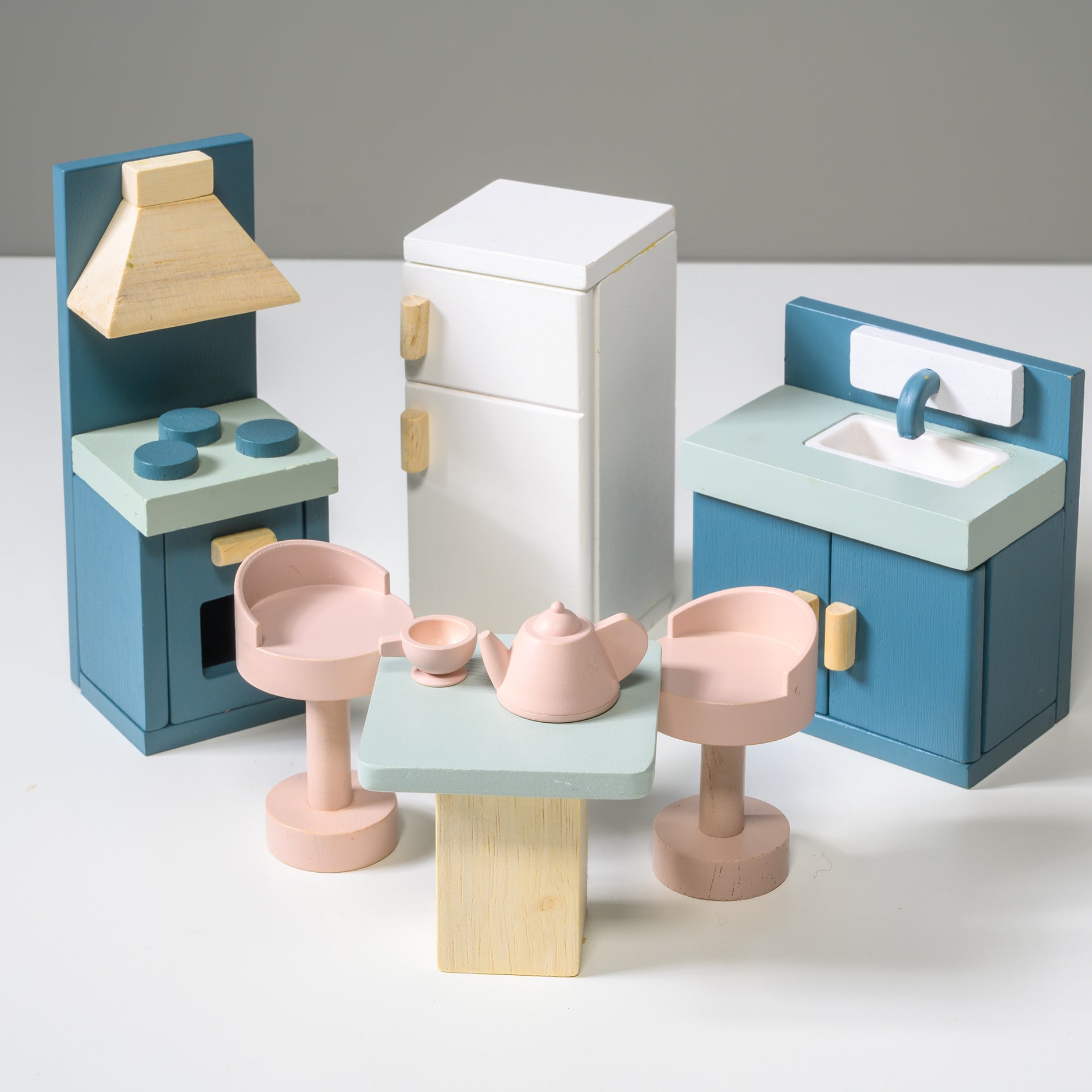 This wooden doll's house furniture set includes a cooker with oven, a fridge with opening doors, a sink unit with cupboard, a table, 2 stools, a teapot and 2 cups.