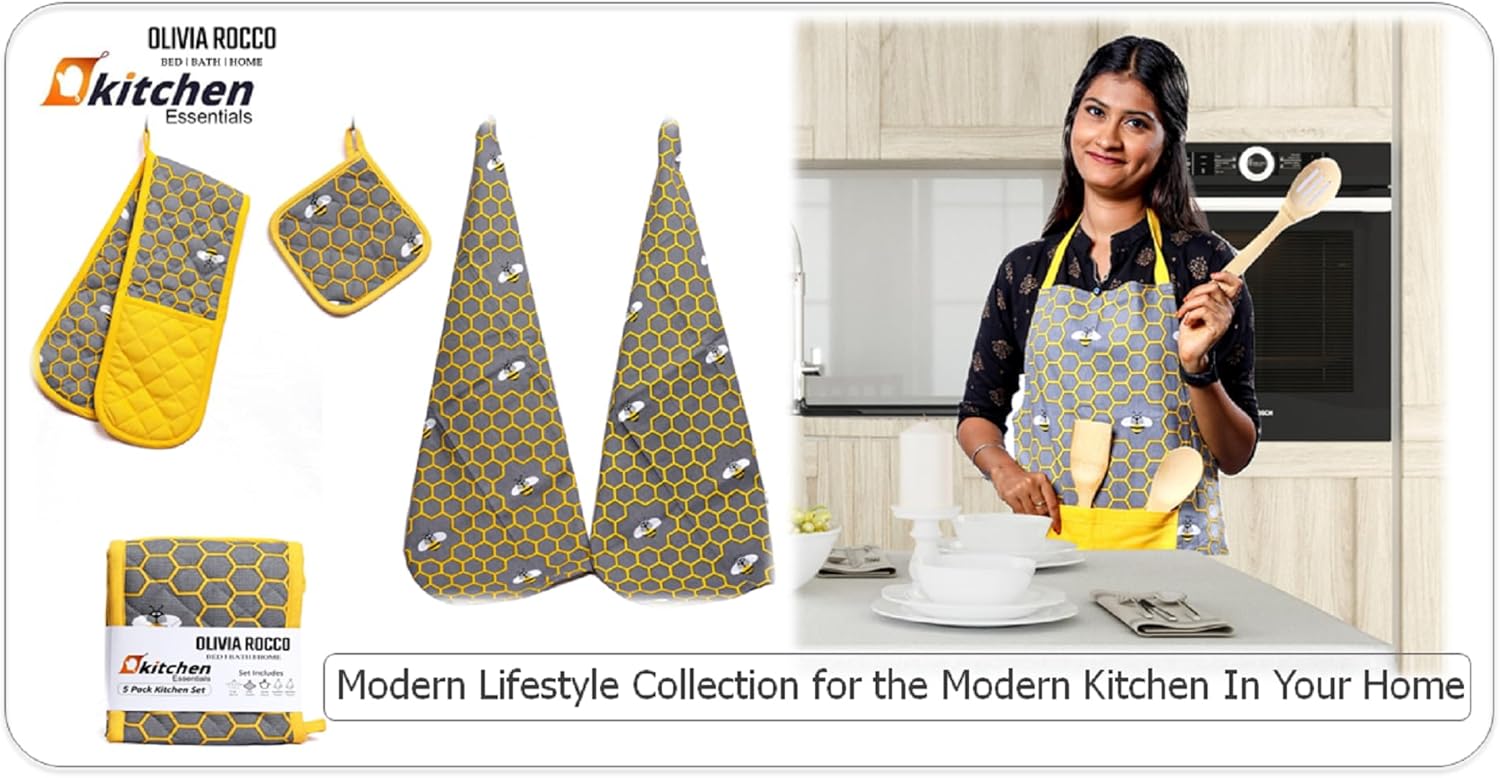 Kitchen Sets Apron Double Oven Gloves Towel Set Heat Resistant Oven Mitts Pot Holder for Home Kitchen Baking and Cooking Pack of 5 by OLIVIA ROCCO