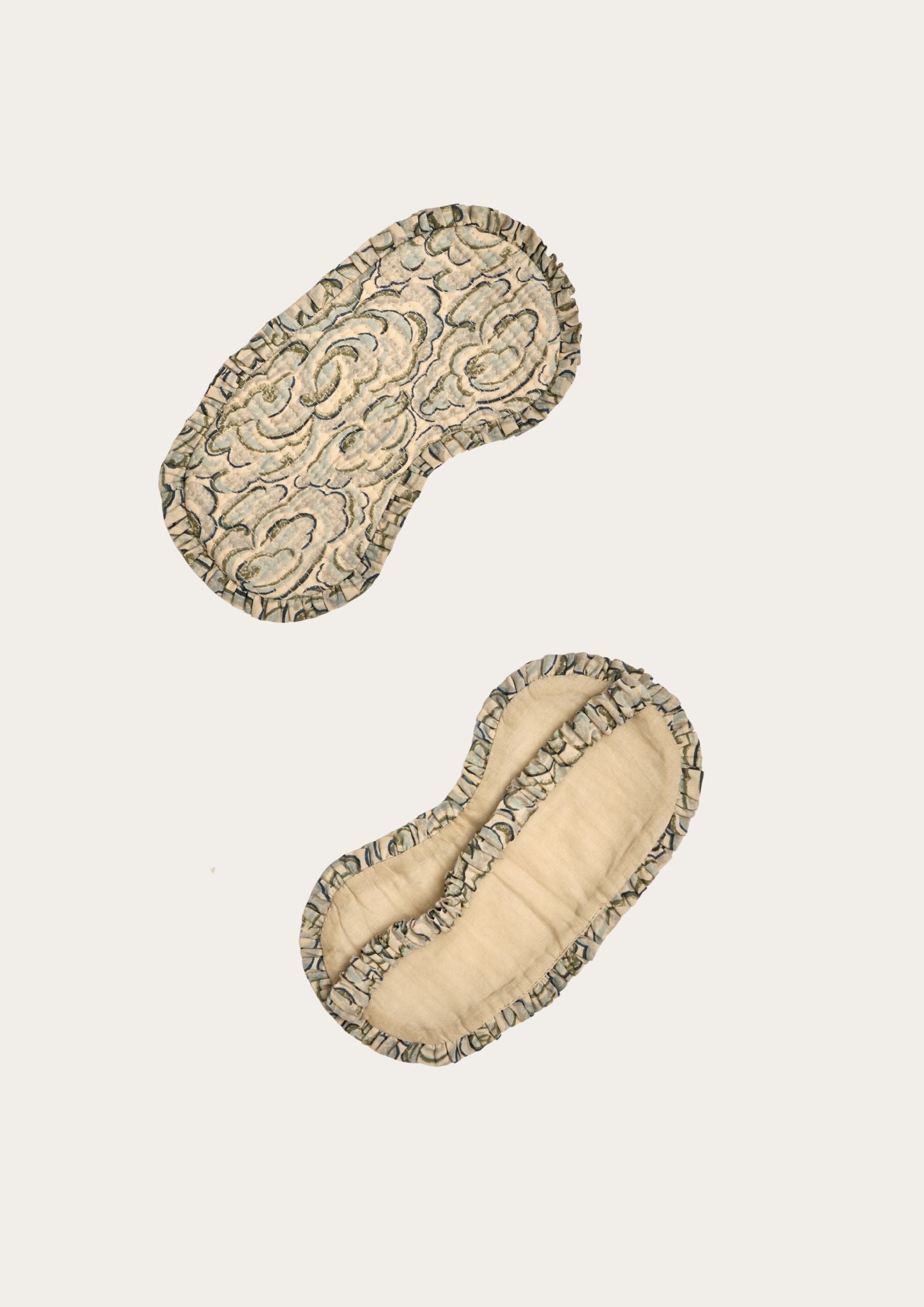 Handcrafted from soft, breathable cotton with a silk lining, this eye mask is designed for restful sleep and moments of calm. Each piece is hand block printed in Jaipur using our signature Kumo Clouds design — a gentle, flowing pattern inspired by drifting skies. Lightly quilted for comfort and finished with an elasticated strap, it’s the perfect travel companion or bedtime ritual essential.