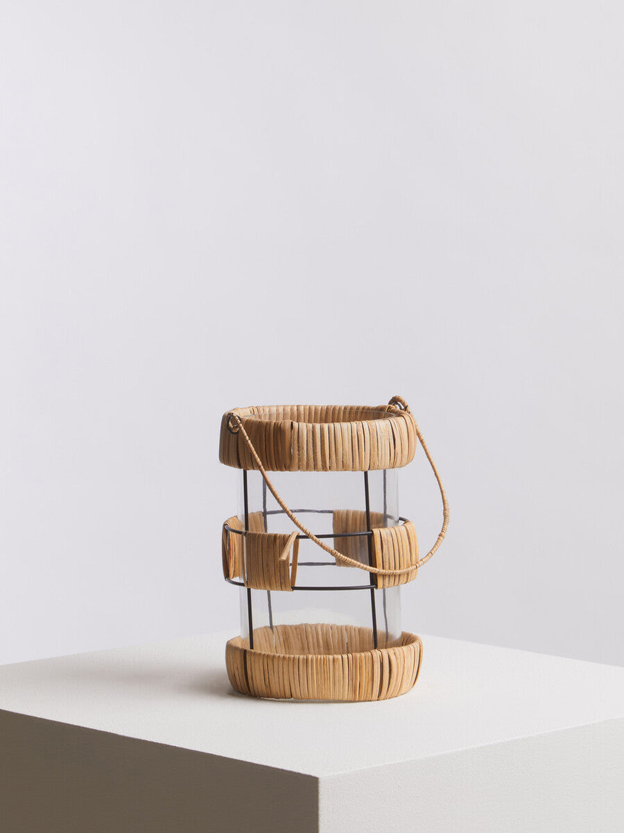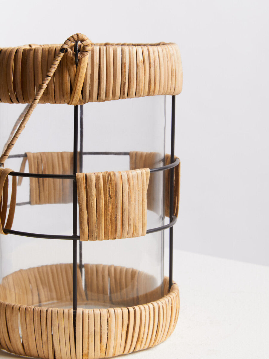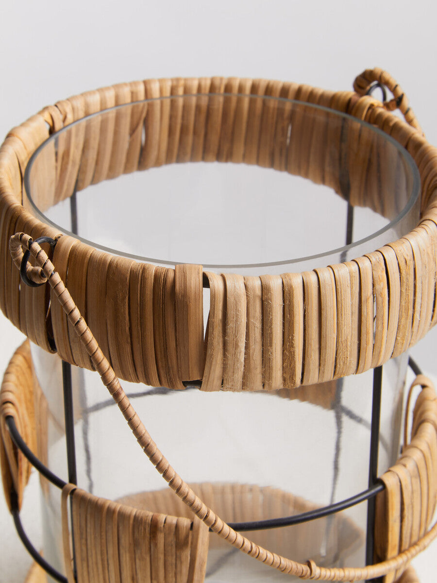Encased in a black finish iron wire cage, the Kuta natural and clear lantern features a cylindrical glass body. Natural rattan is expertly weaved around the top and bottom of this round glass lantern complementing the clear body. A rope wrapped handle over the lantern complete the look. This large lantern is a coastal accent piece offering a refreshing airy feel to your window sill or shelf.