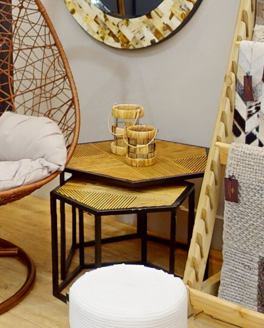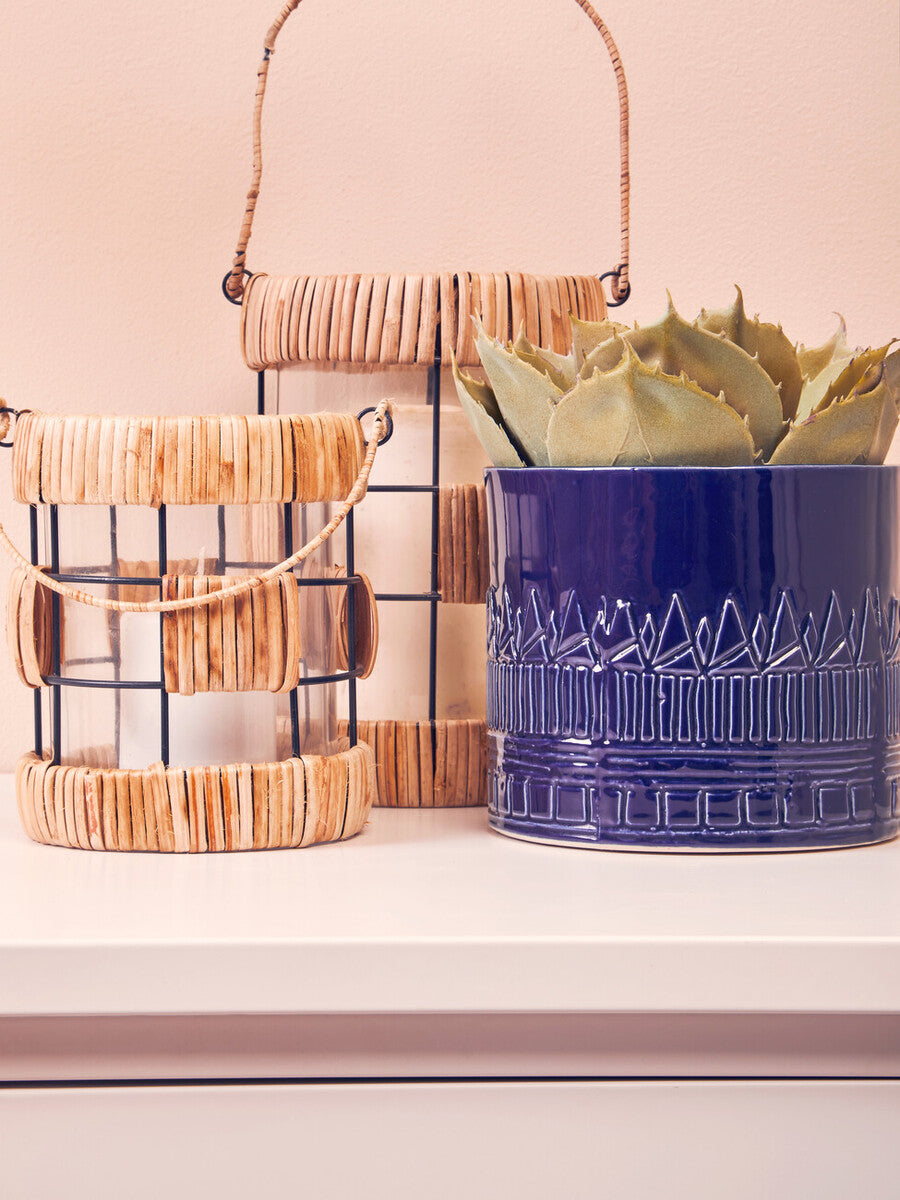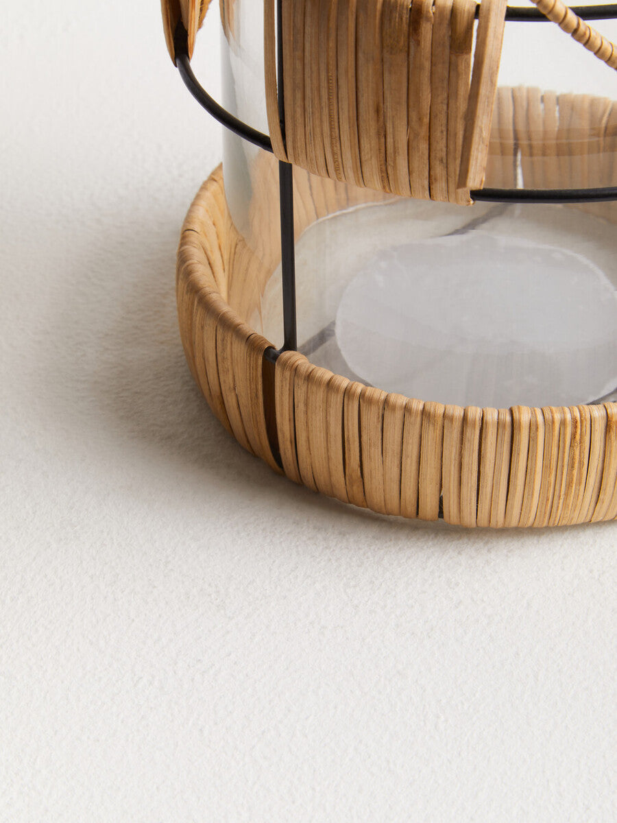 Encased in a black finish iron wire cage, the Kuta natural and clear lantern features a cylindrical glass body. Natural rattan is expertly weaved around the top and bottom of this round glass lantern complementing the clear body. A rope wrapped handle over the lantern complete the look. This large lantern is a coastal accent piece offering a refreshing airy feel to your window sill or shelf.