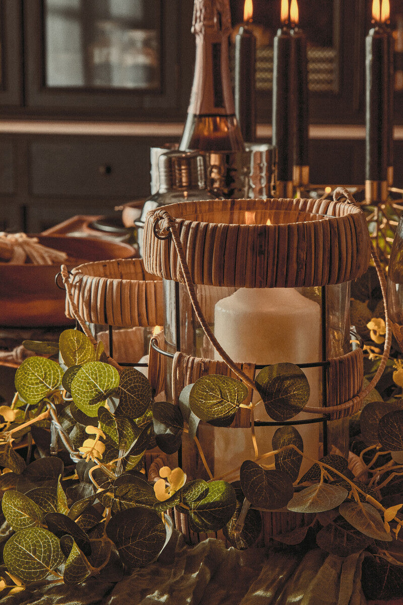 Encased in a black finish iron wire cage, the Kuta natural and clear lantern features a cylindrical glass body. Natural rattan is expertly weaved around the top and bottom of this round glass lantern complementing the clear body. A rope wrapped handle over the lantern complete the look. This small lantern is a coastal accent piece offering a refreshing airy feel to your window sill or shelf.