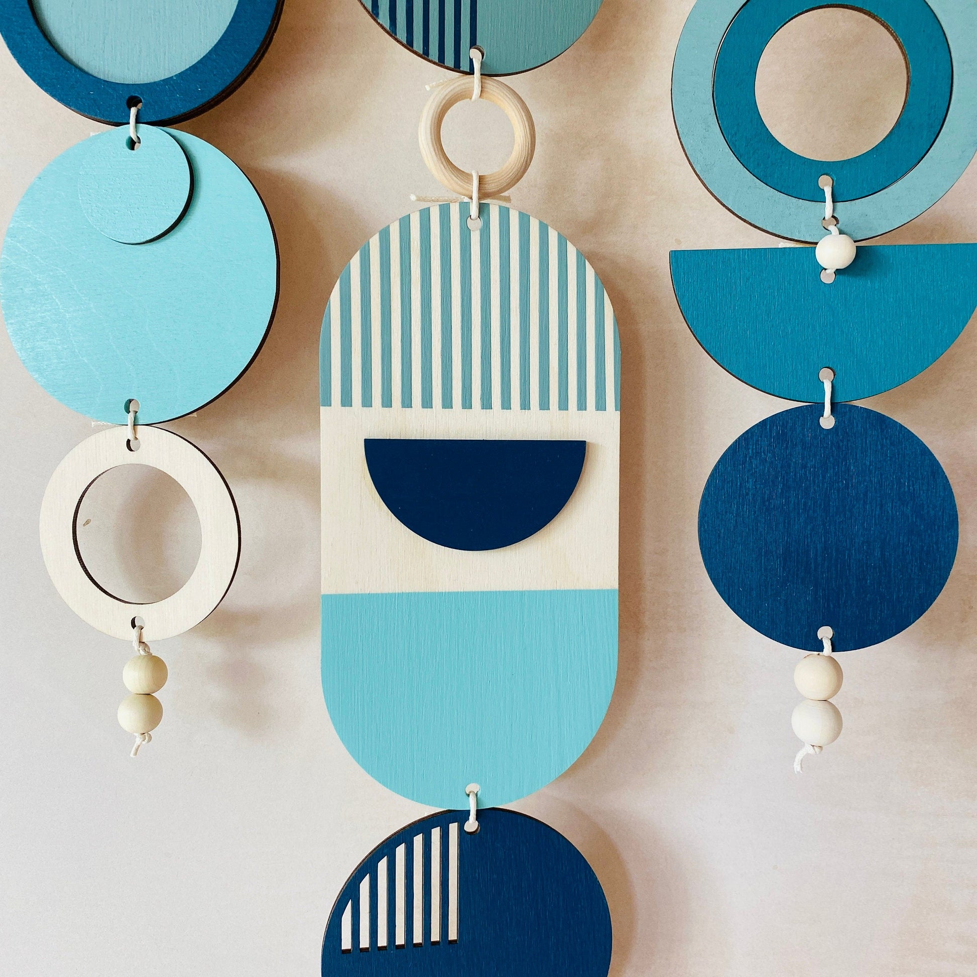 Lovingly handmade modern wall art. This Piece is made from plywood, paint, waxed cord and wooden beads. The colours used are a range of Blue tones. This large wall hanging would make a beautiful addition to any room to create a modern mid-century feel. Made from sustainable Birch plywood, hand painted and constructed in Milton Keynes, England.