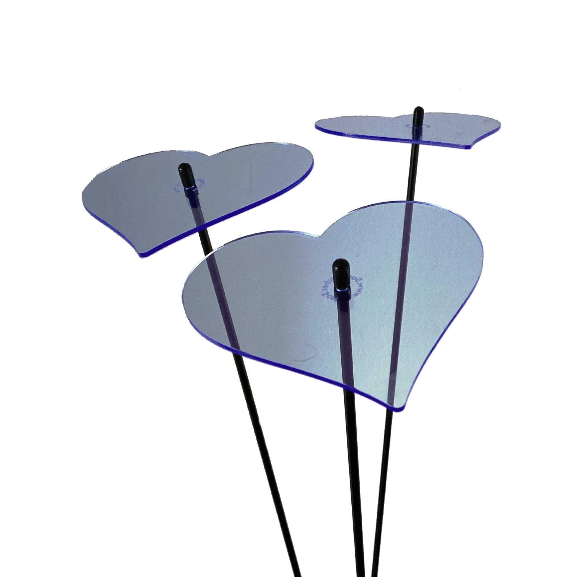 This Set of 3 SunCatchers 'Heart' consists of: - a three wide, glowing light collector in red, orange, yellow, green or blue - three 75cm long, black swing rod, - matching support rings and end caps, planted it is about 70cm high and looks great in your flower bed or pot.