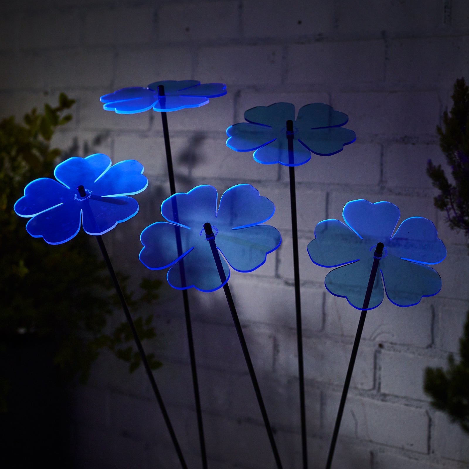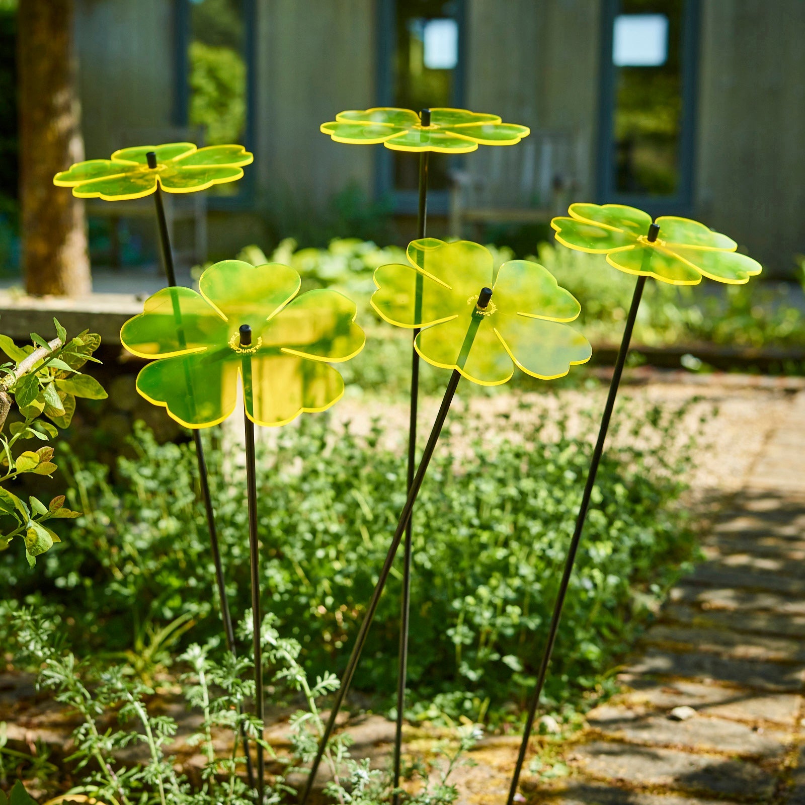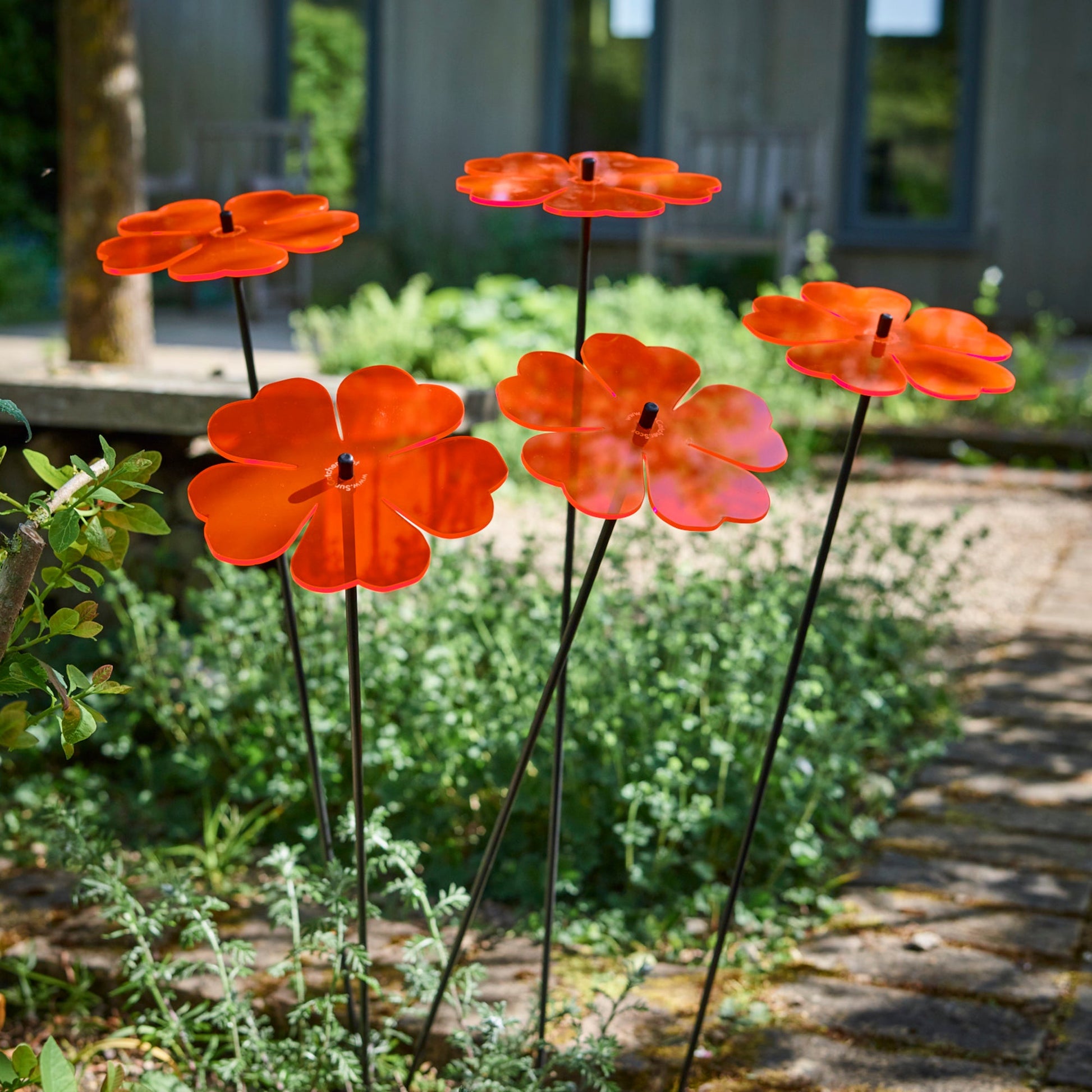 This set includes five double-blossom flowers in a choice of colours: red, orange, yellow, green, and blue, each mounted on rods and connectors that create a 75 cm swing rod for natural movement. Once placed, they stand approximately 70 cm tall, offering a bold, eye-catching splash of colour in any garden.