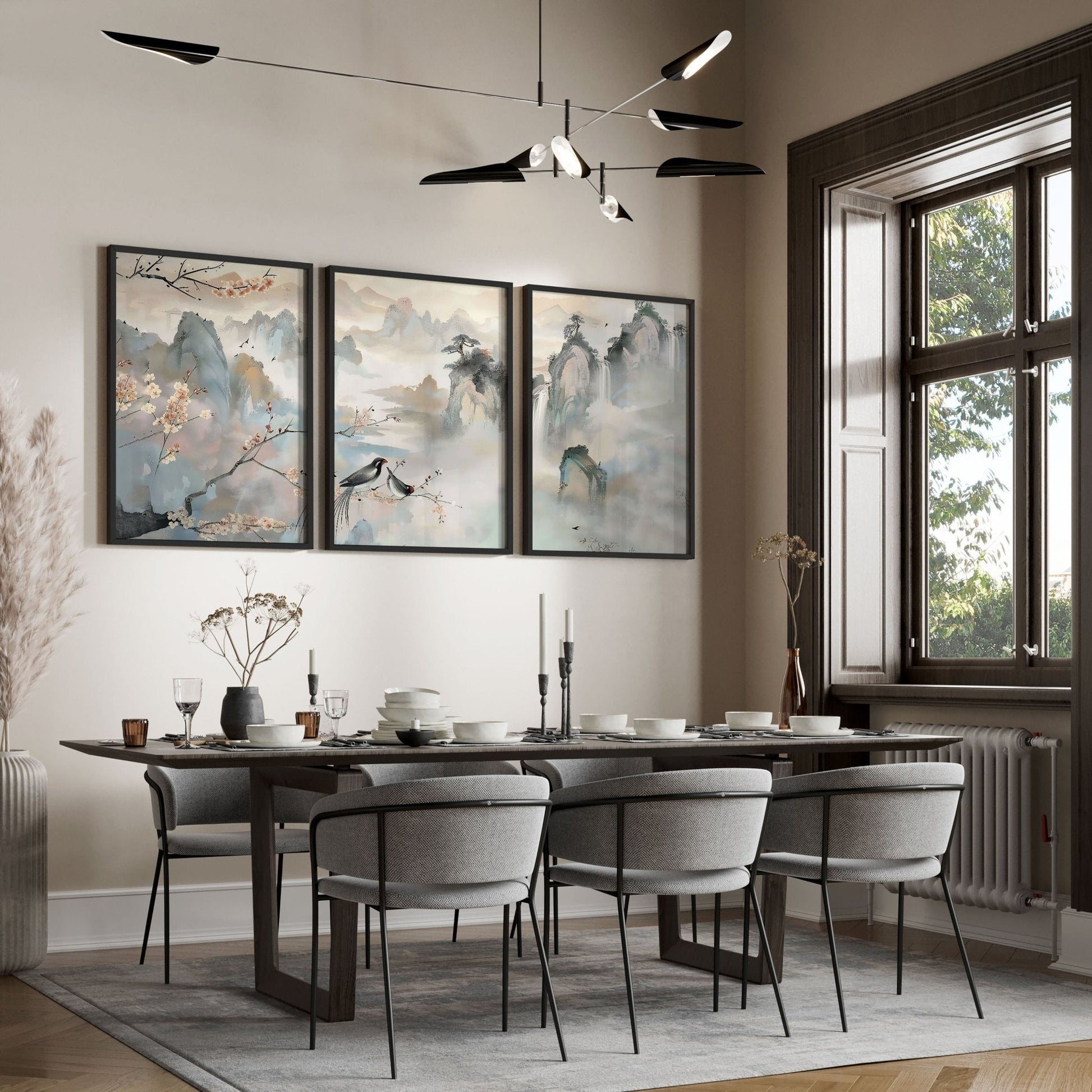 Transform your living room into a sanctuary of elegance and charm with our Large Pictures For Living Room. We designed this exquisite Set of 3 wall art prints to capture attention and add a touch of sophistication to any space. Featuring a certainly delicate Pastel colour palette combined with the timeless Chinoiserie style, these prints breathe life into your home decor, creating a serene yet stylish ambience.