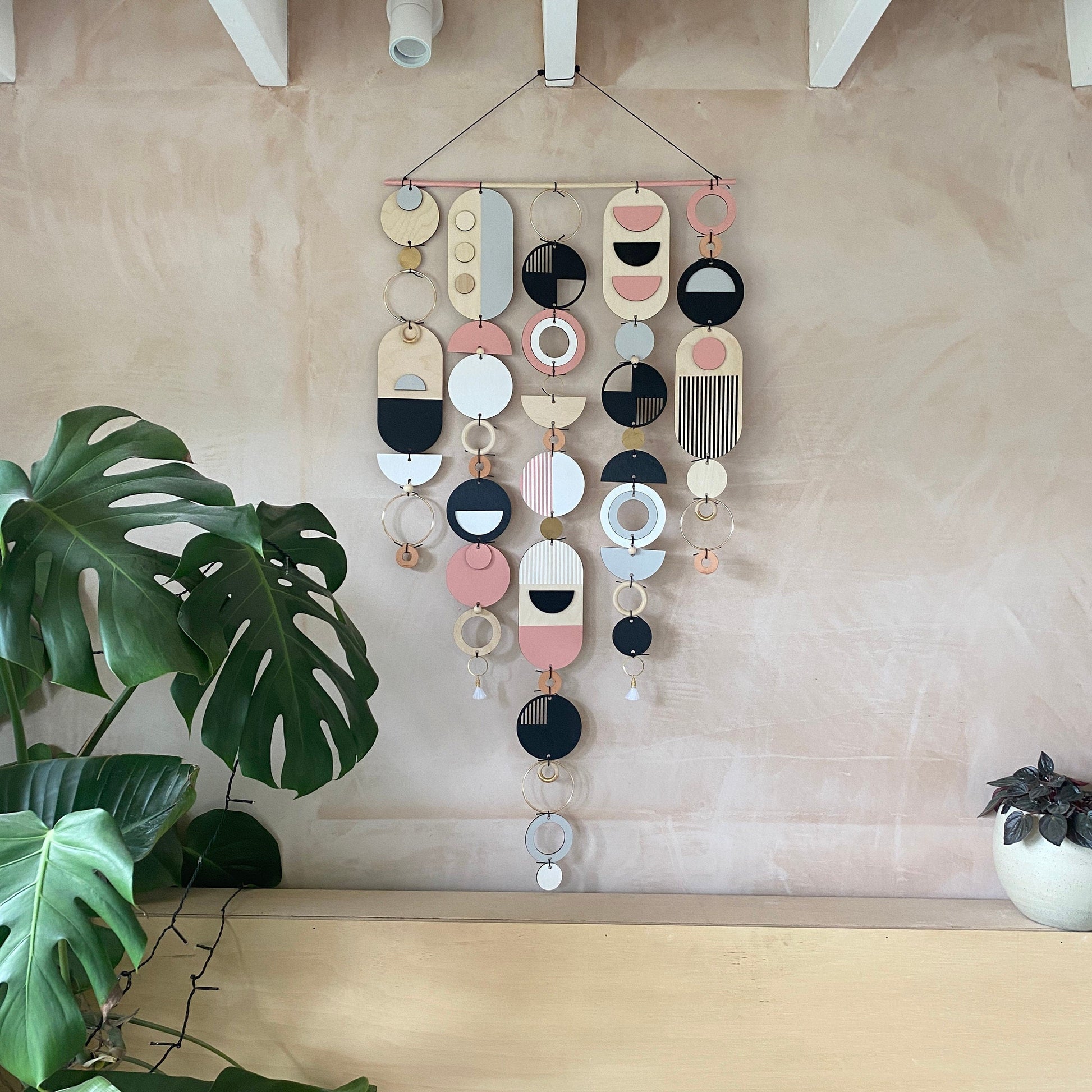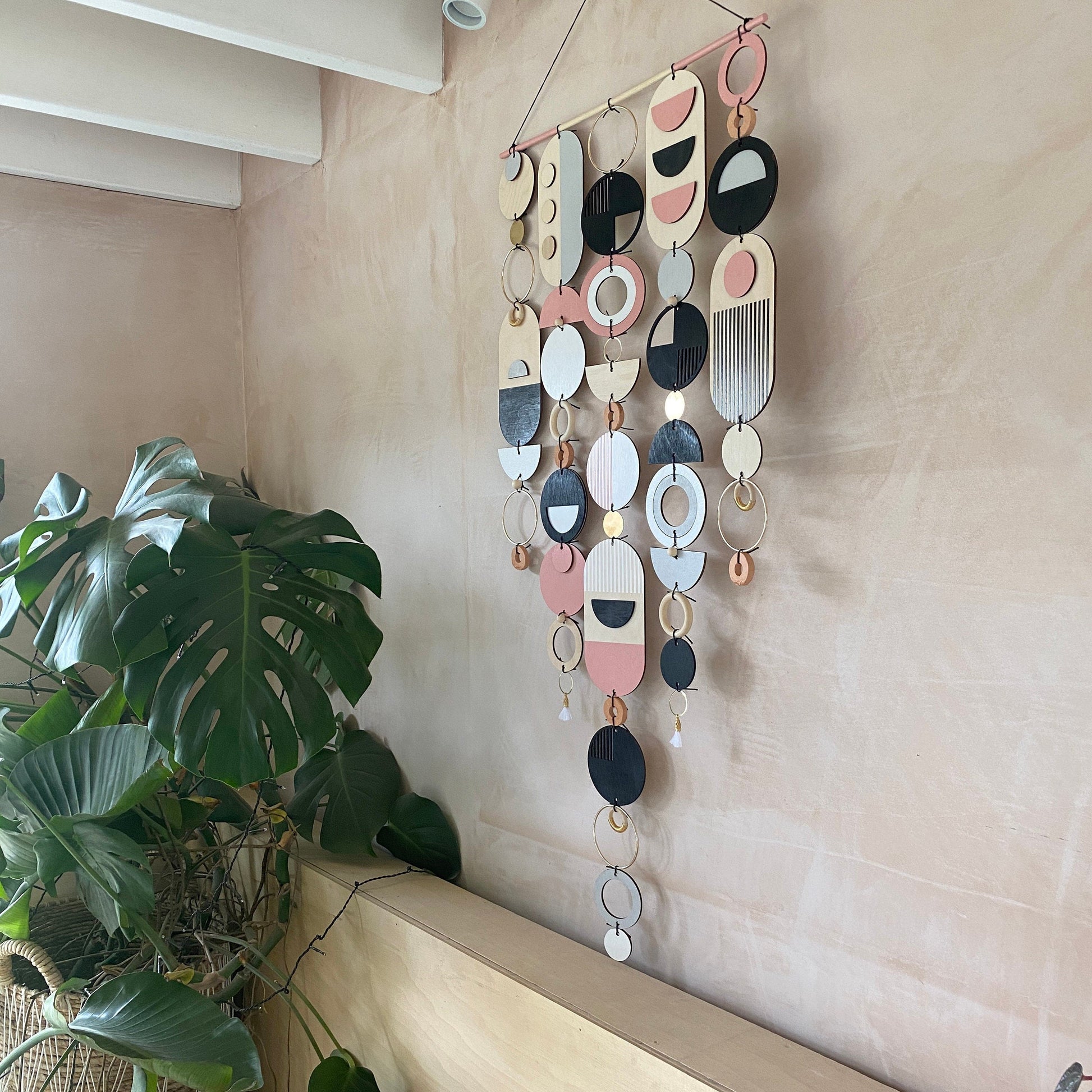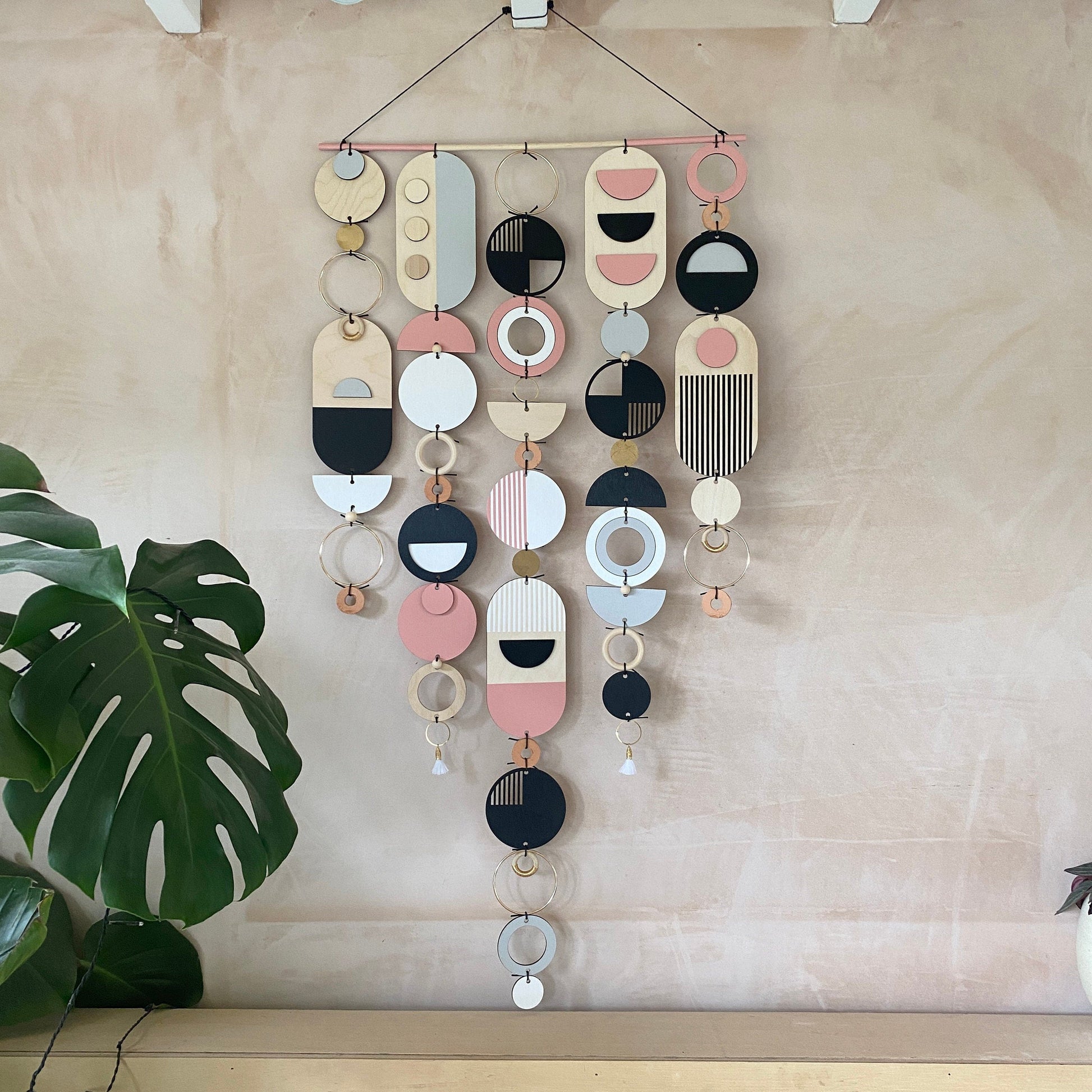 Lovingly handmade modern wall art. This Piece is made from plywood, paint, metal, ceramics, waxed cord, tassels and wooden beads. The colours used are Pink, Black, Grey, White and gold. This large wall hanging would make a beautiful addition to any room to create a modern mid-century feel. Made from sustainable Birch plywood, hand painted and constructed in Milton Keynes, England.