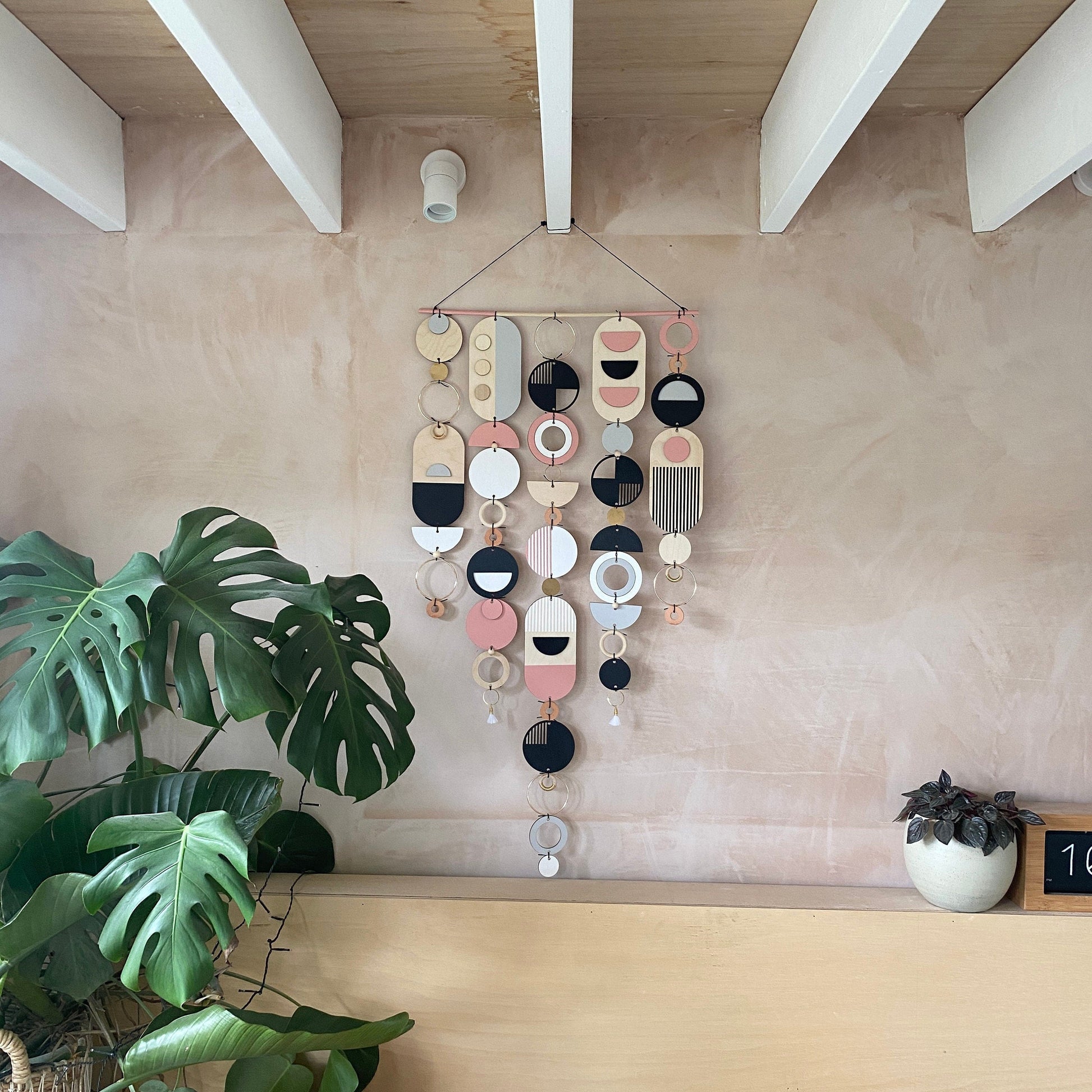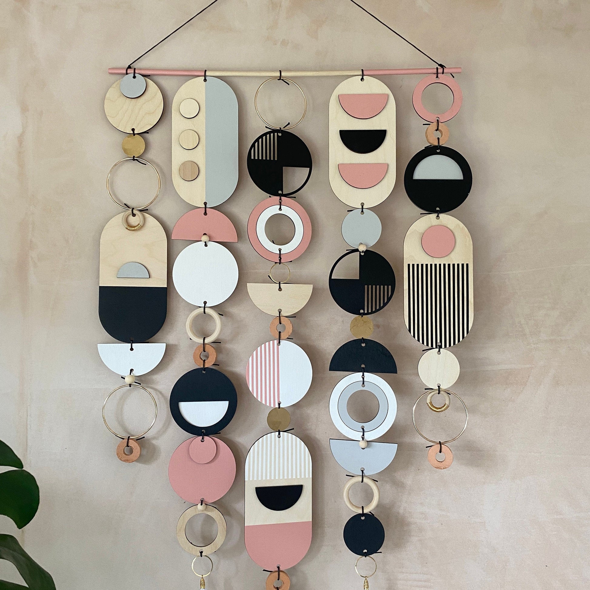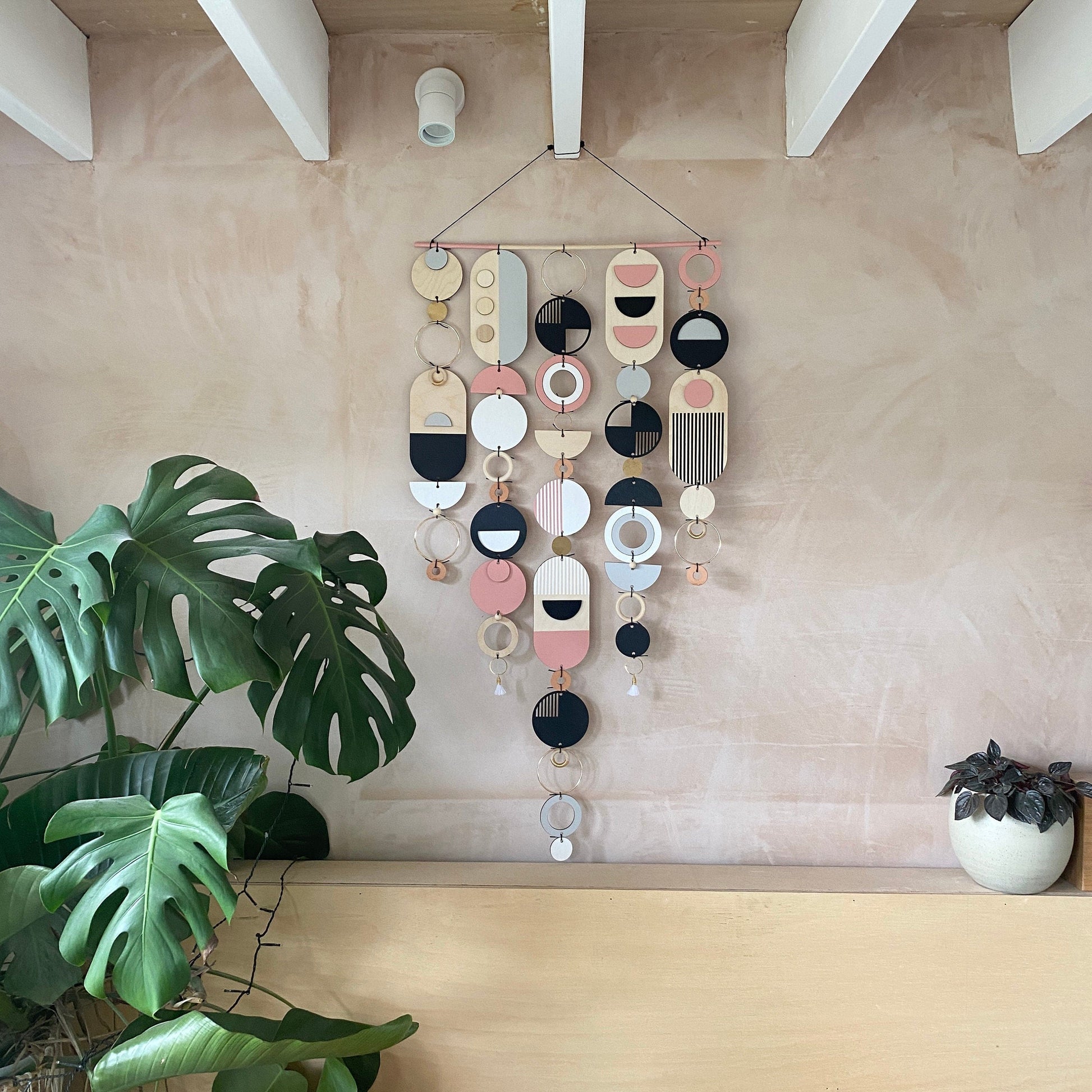 Lovingly handmade modern wall art. This Piece is made from plywood, paint, metal, ceramics, waxed cord, tassels and wooden beads. The colours used are Pink, Black, Grey, White and gold. This large wall hanging would make a beautiful addition to any room to create a modern mid-century feel. Made from sustainable Birch plywood, hand painted and constructed in Milton Keynes, England.