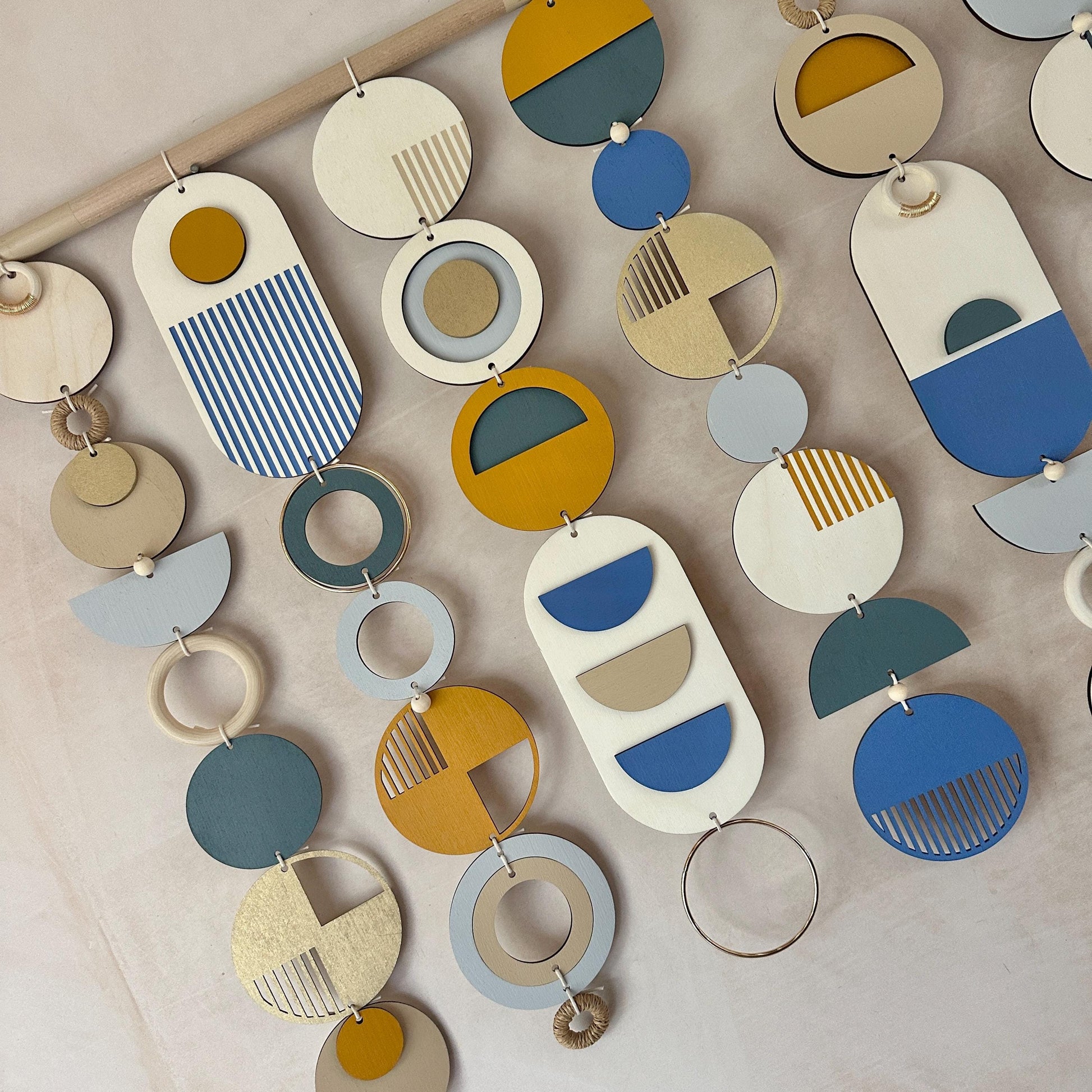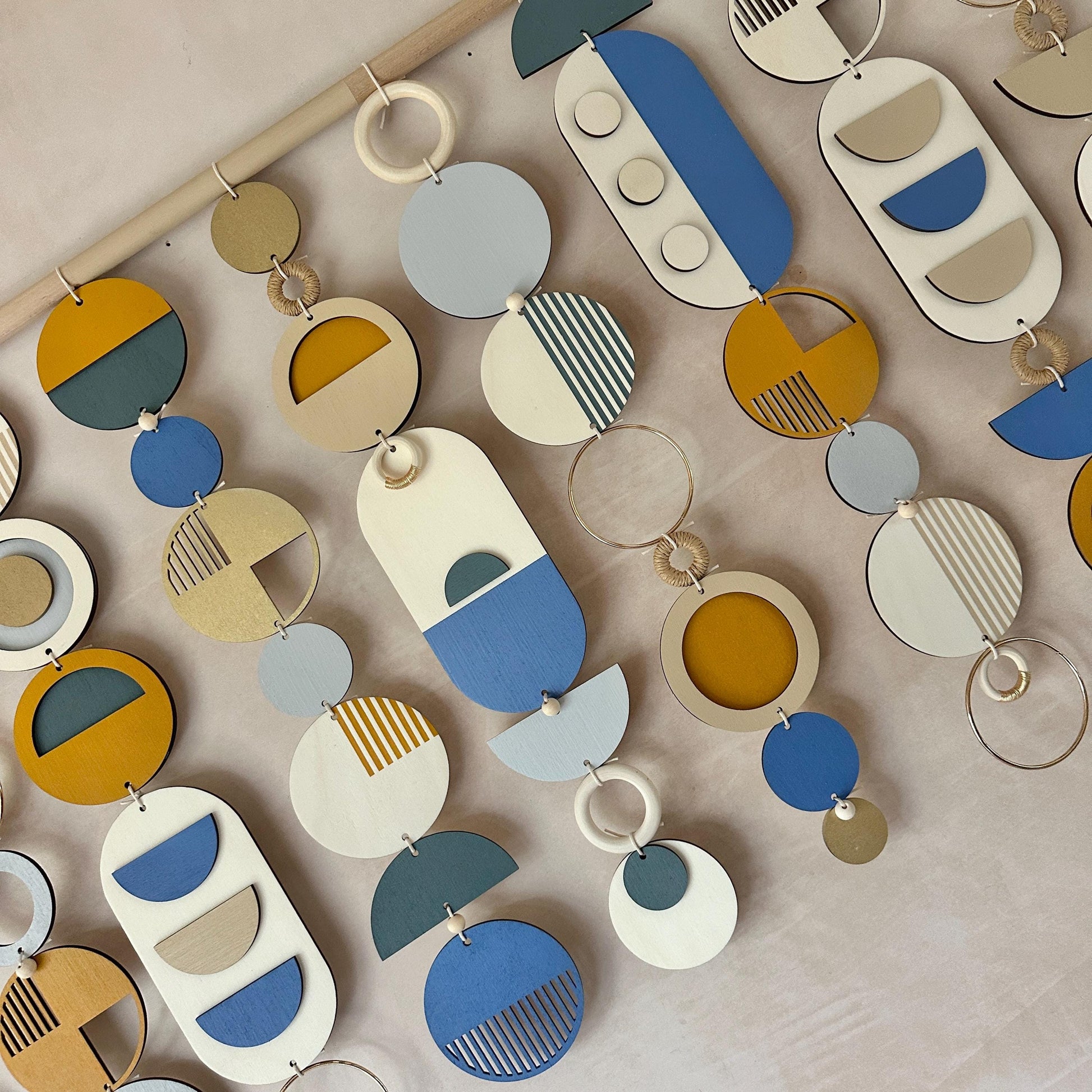This large wood wall hanging would look great above a bed on your bedroom or above the sofa in your living room. The abstract geometric pattern and carefully curated colour palette will add a touch of modern art to your home or office decor.