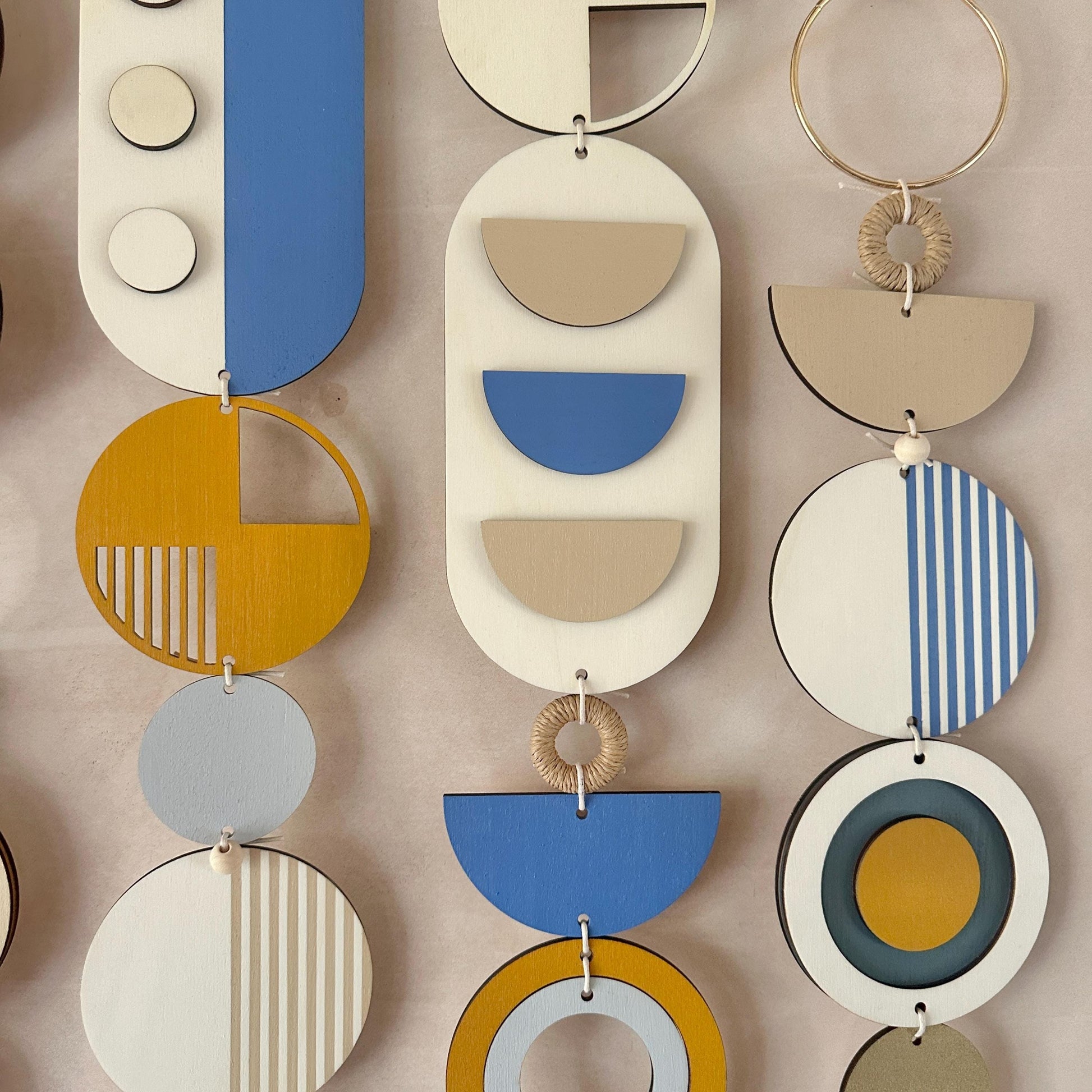 - Each plywood piece is painted in a carefully curated colour palette of blue, green, yellow, grey, beige with gold accented pieces. Some parts of the wood are left unpainted.