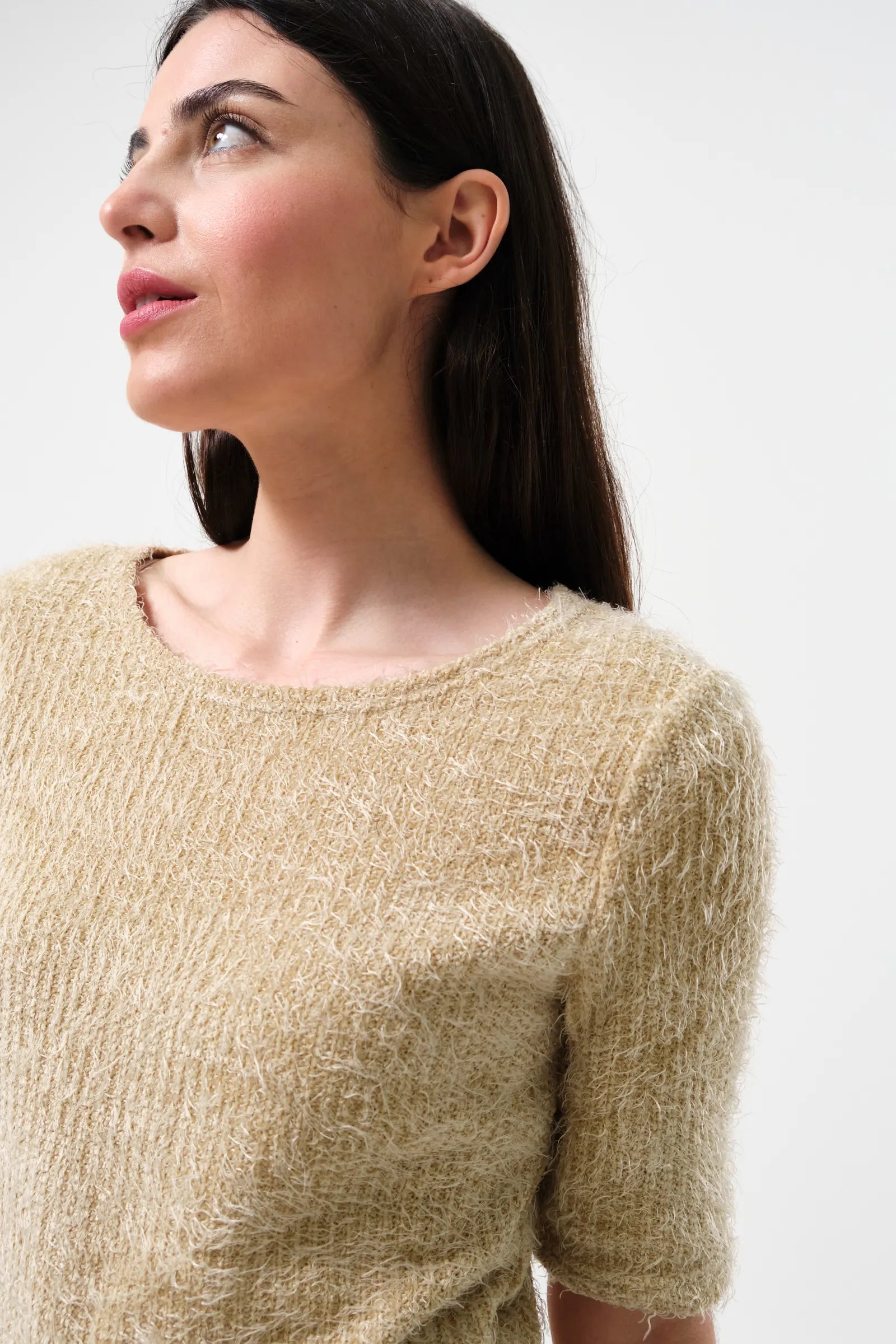 Cosy up this autumn with the Laureen Eyelash Rib short-sleeve jumper in creamy café au lait colour. Made from a soft textured yarn, this jumper provides both warmth and comfort. No itch, just stylish versatility for your wardrobe!