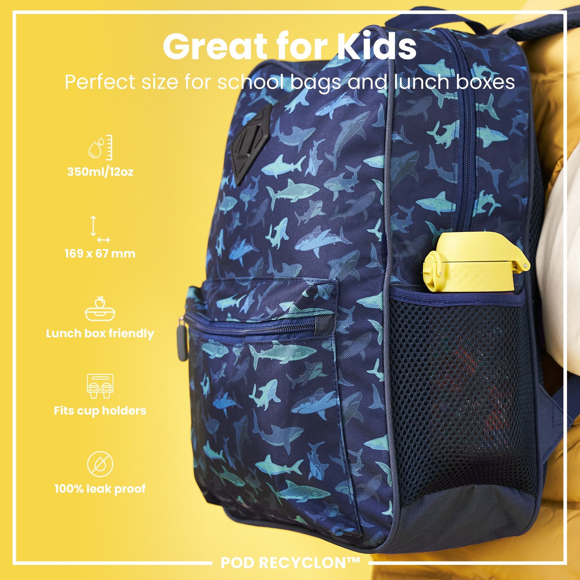 Small enough as a kids water bottle for their school lunch boxes or for smaller bags about town. The width of a soda can, it fits perfectly into all car cup holders and pockets on all backpacks.