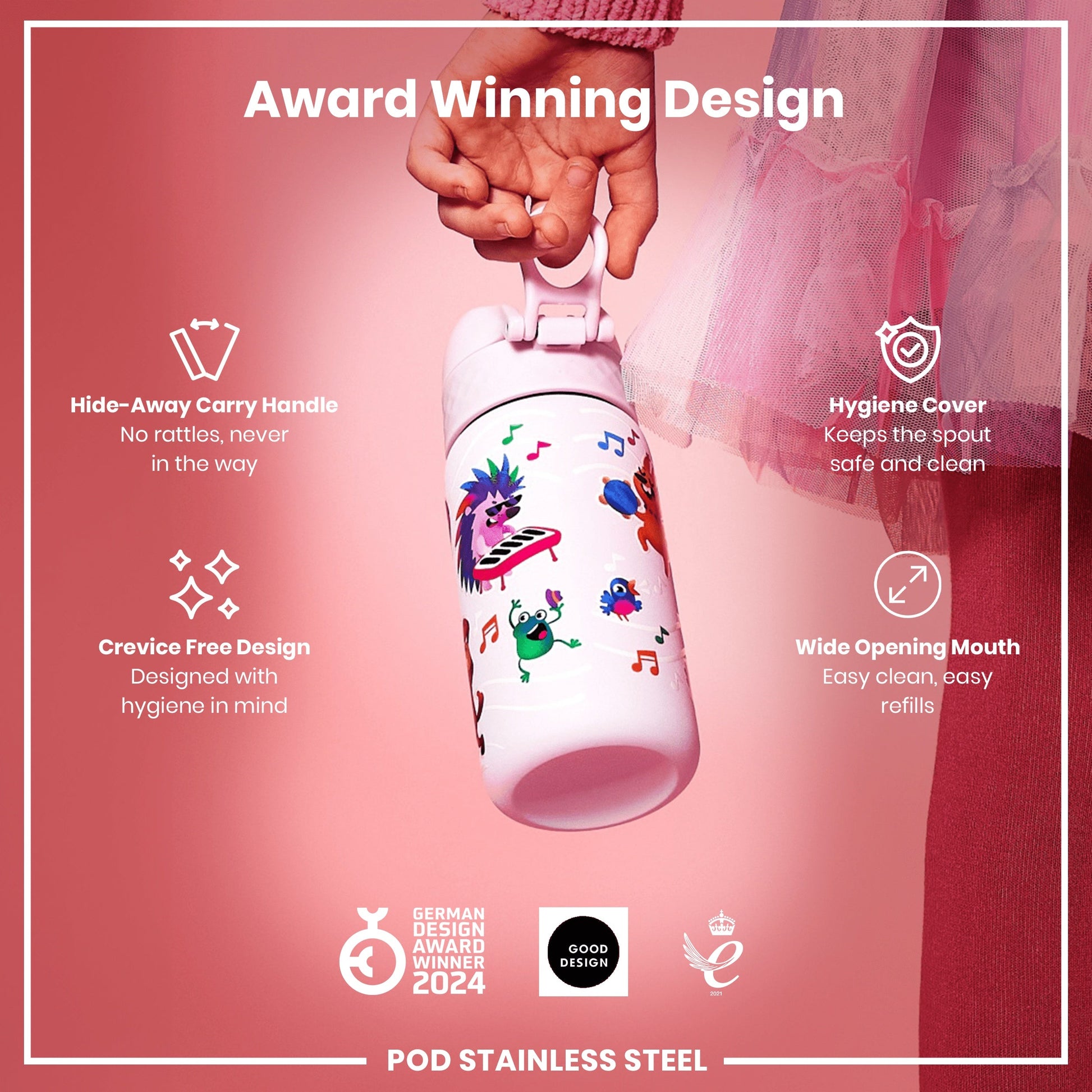 100% leak proof 400ml / 13oz stainless steel water bottles with a smooth flow for spill-free hydration and hygienic full-flip top cover for one handed use on-the-go.