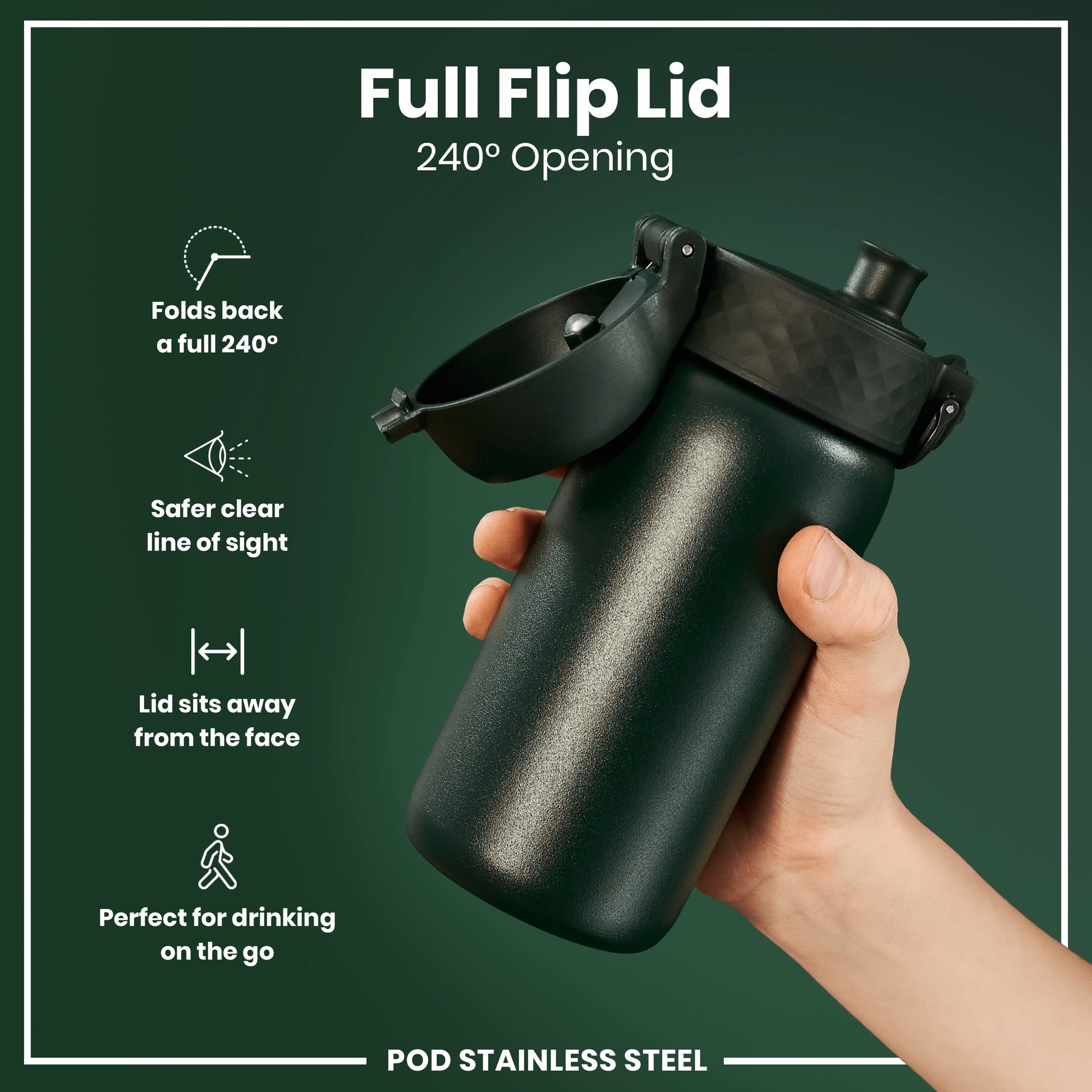 100% leak proof 400ml / 13oz stainless steel green water bottle with a smooth flow for spill-free hydration and hygienic full-flip top cover for one handed use on-the-go.