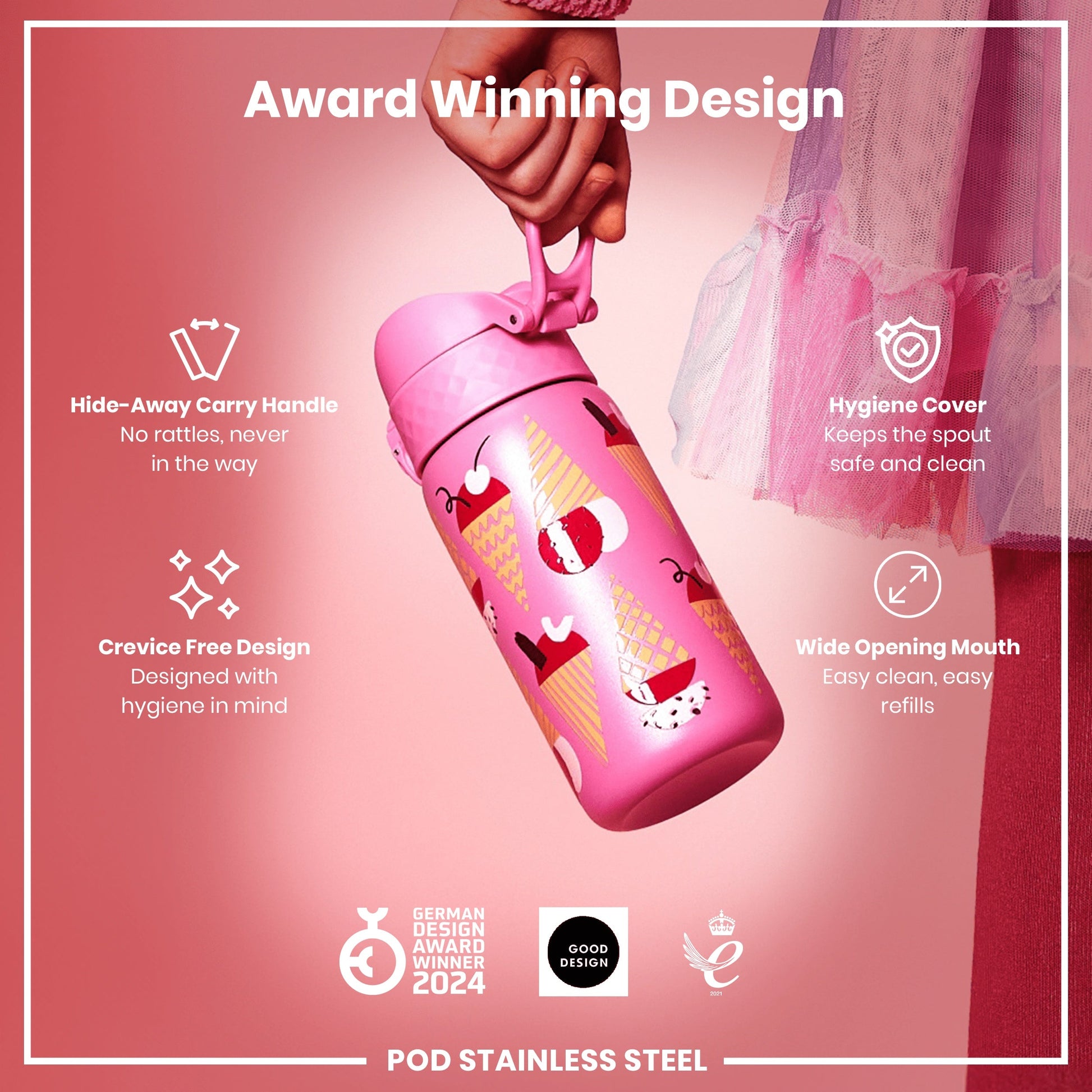 Made from lightweight stainless steel. Stainless steel is extremely durable, lasts for years, and is fully recyclable. This refillable and reusable pink water bottle is food safe, odour resistant, easy to hand wash, and keeps drinks fresh and full of flavour. With a raised 3D tactile feel print.