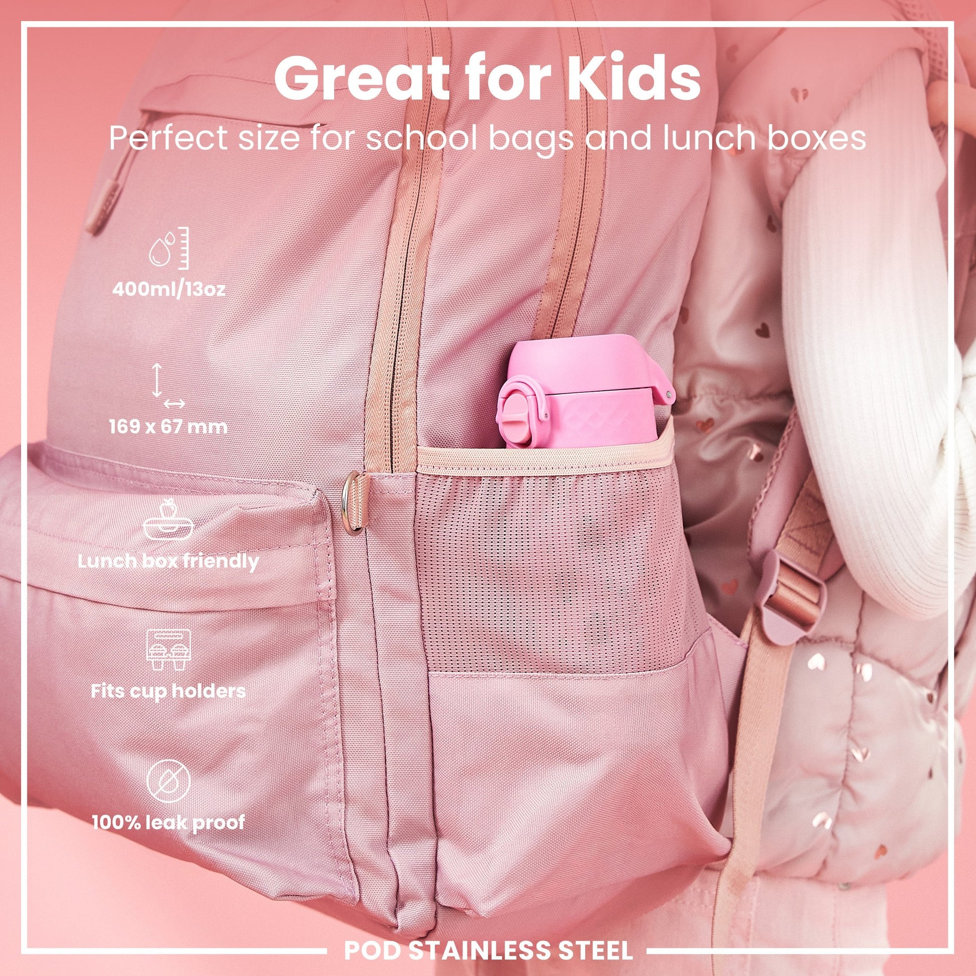 100% leak proof 400ml / 13oz stainless steel water bottles with a smooth flow for spill-free hydration and hygienic full-flip top cover for one handed use on-the-go.